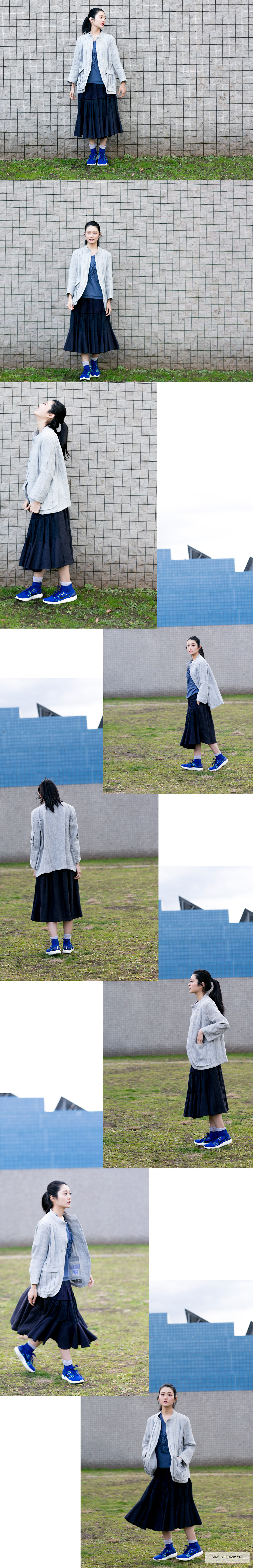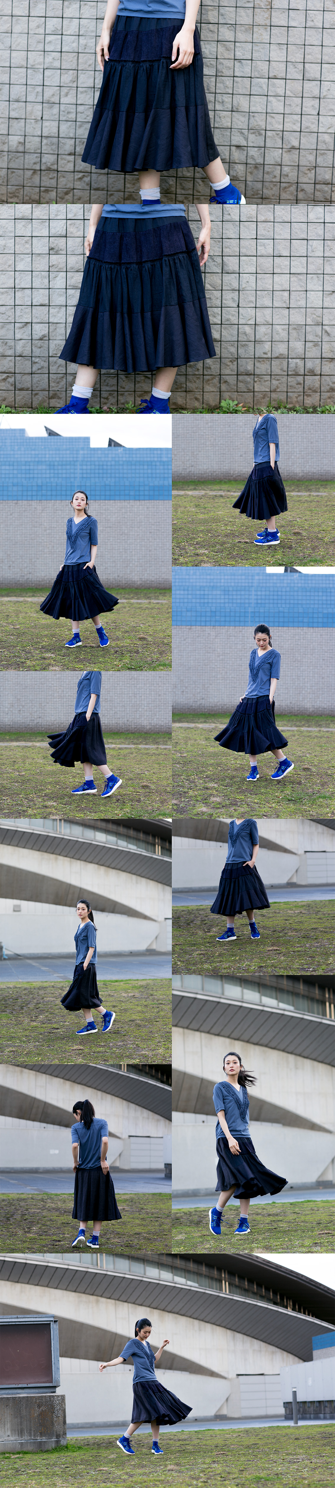 ミドル丈(総丈64 リブ下62丈)のスカートですので、万能に、どの丈のトップスとも相性いいです。 そして一番のオススメは、この色々な濃紺ミックススカートに更に、紺のトップスを合わせるコーディネート。 スカートで使われている濃紺より薄めの紺がオススメですが、また異なる紺を組み合わせることによって、更に もう一種類の紺が組み合わさることになり、それもまた美しいはずです。 FFコーディネートでは同時販売の鉄紺デコレーションVネックTシャツを合わせていますが、ブルー系の濃淡を組み合わせると更に面白いと思います。もちろん、清潔感漂うホワイトや、ライトグレーのトップスを合わせても素敵です。