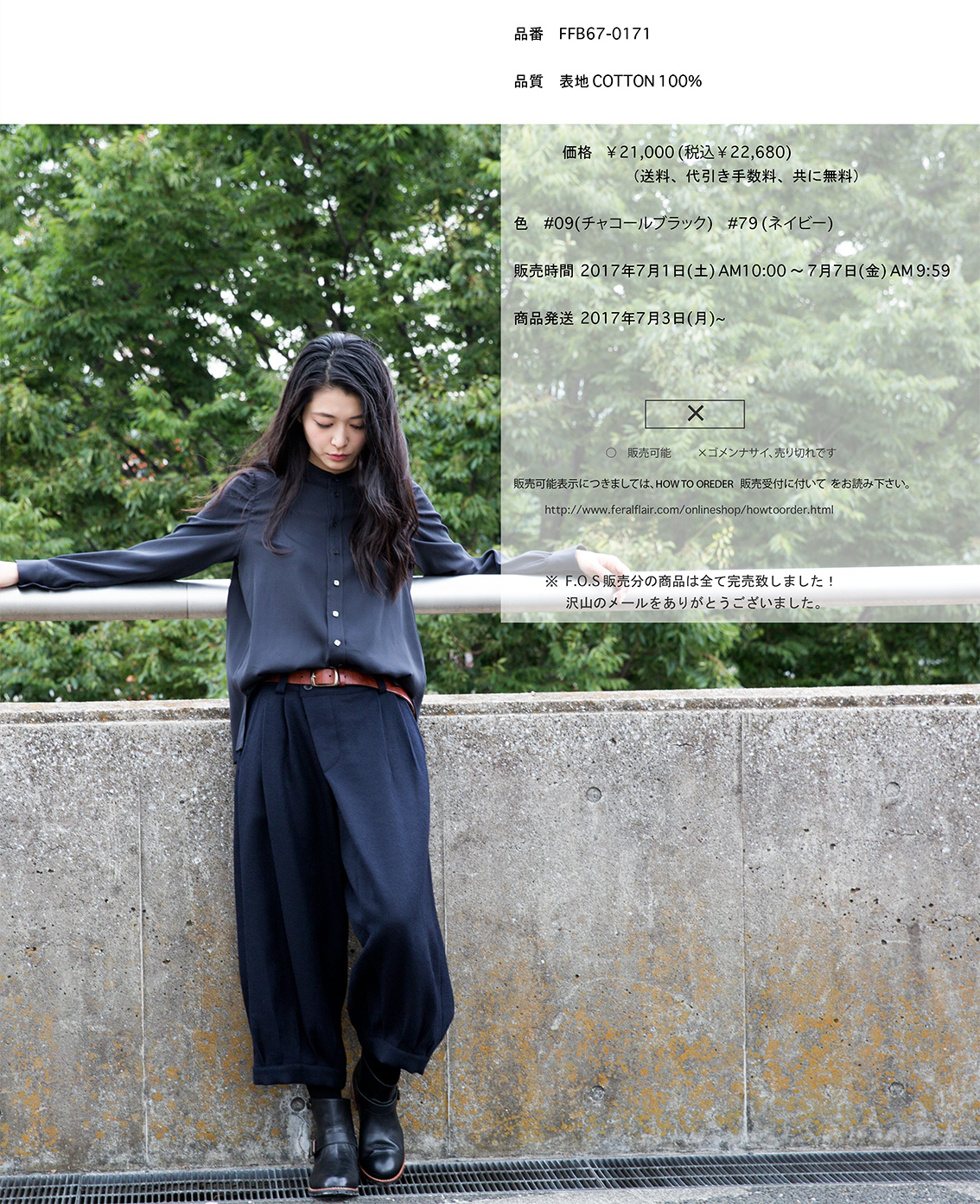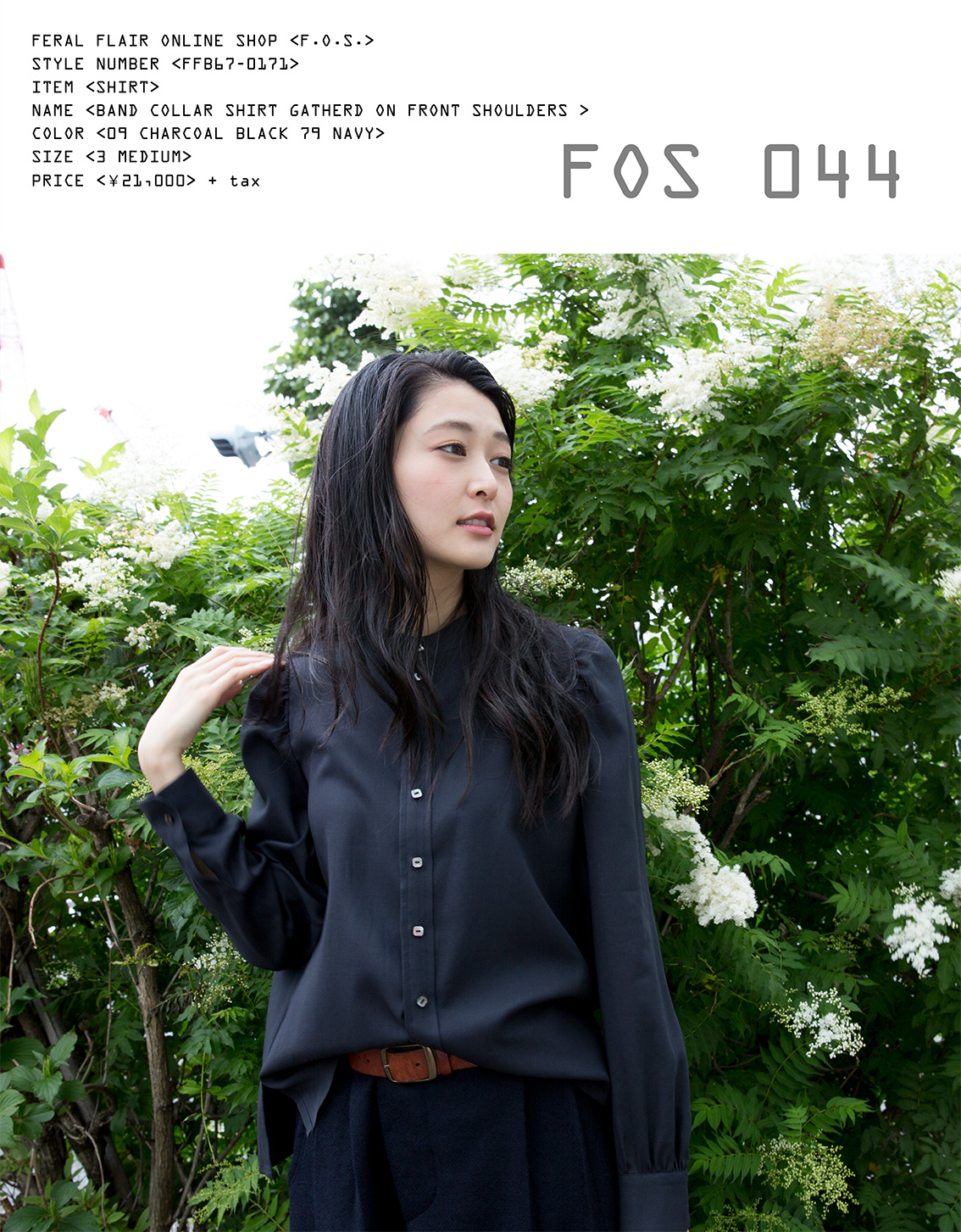 H.P.ではガーリーに膝下丈のプリントスカートに合わせ、ジャケットのインナーとしてもコーディネートしていて、今回のFOSでは、パンツに合わせボーイッシュなスタイルでの提案をしていますが、どちらのスタイルにもマルチに対応出来ます。