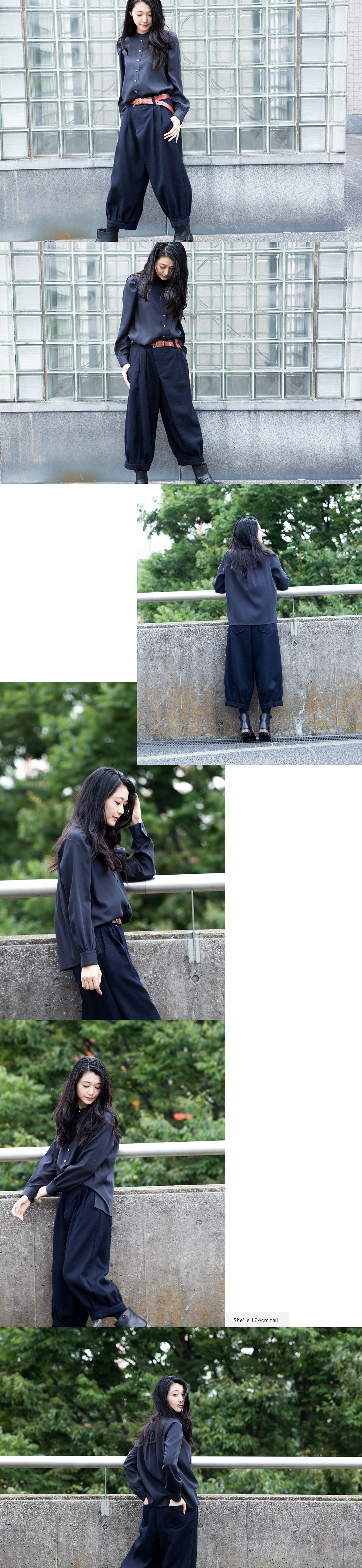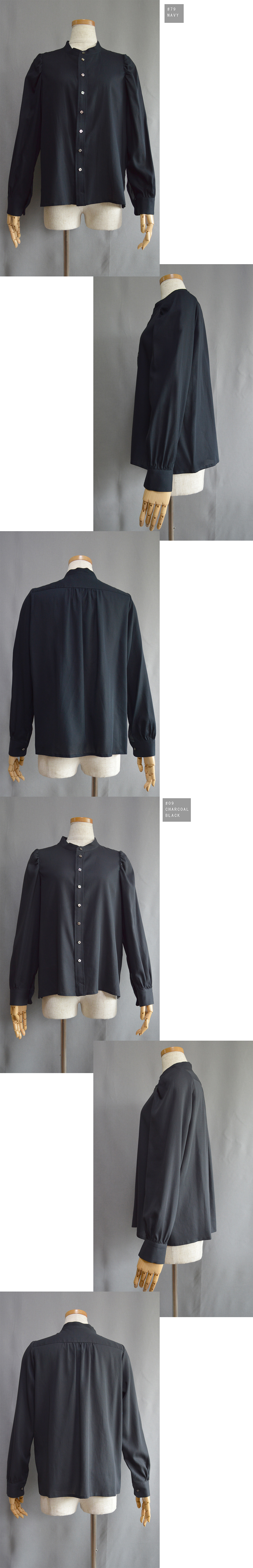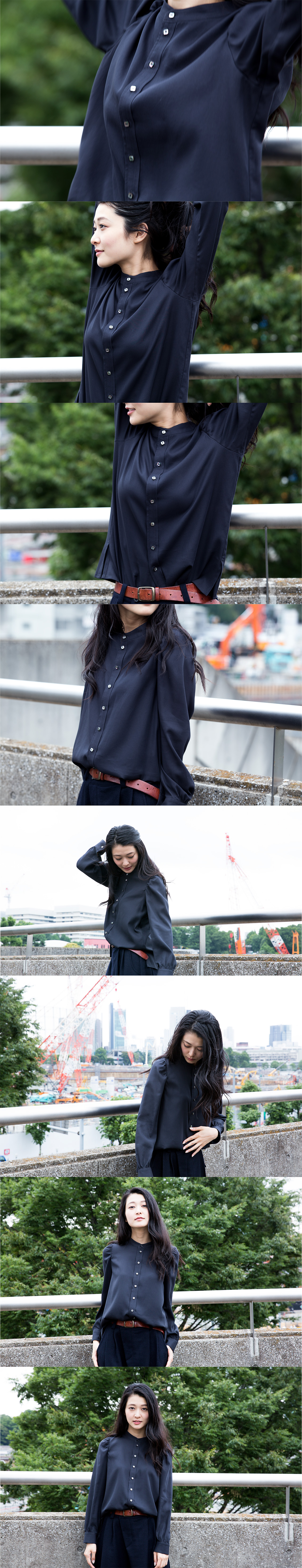 前肩のギャザーアクセントがキュートでしかも大人っぽい雰囲気を味わえるシャツブラウス、色もシックにほとんど黒に近いチャコールとやはり深い色合いのネイビーとの二色展開なので、白などの爽やかな色と合わせても、プリントなどの派手めな色と合わせても大人の雰囲気のコーディネートで決まると思います。