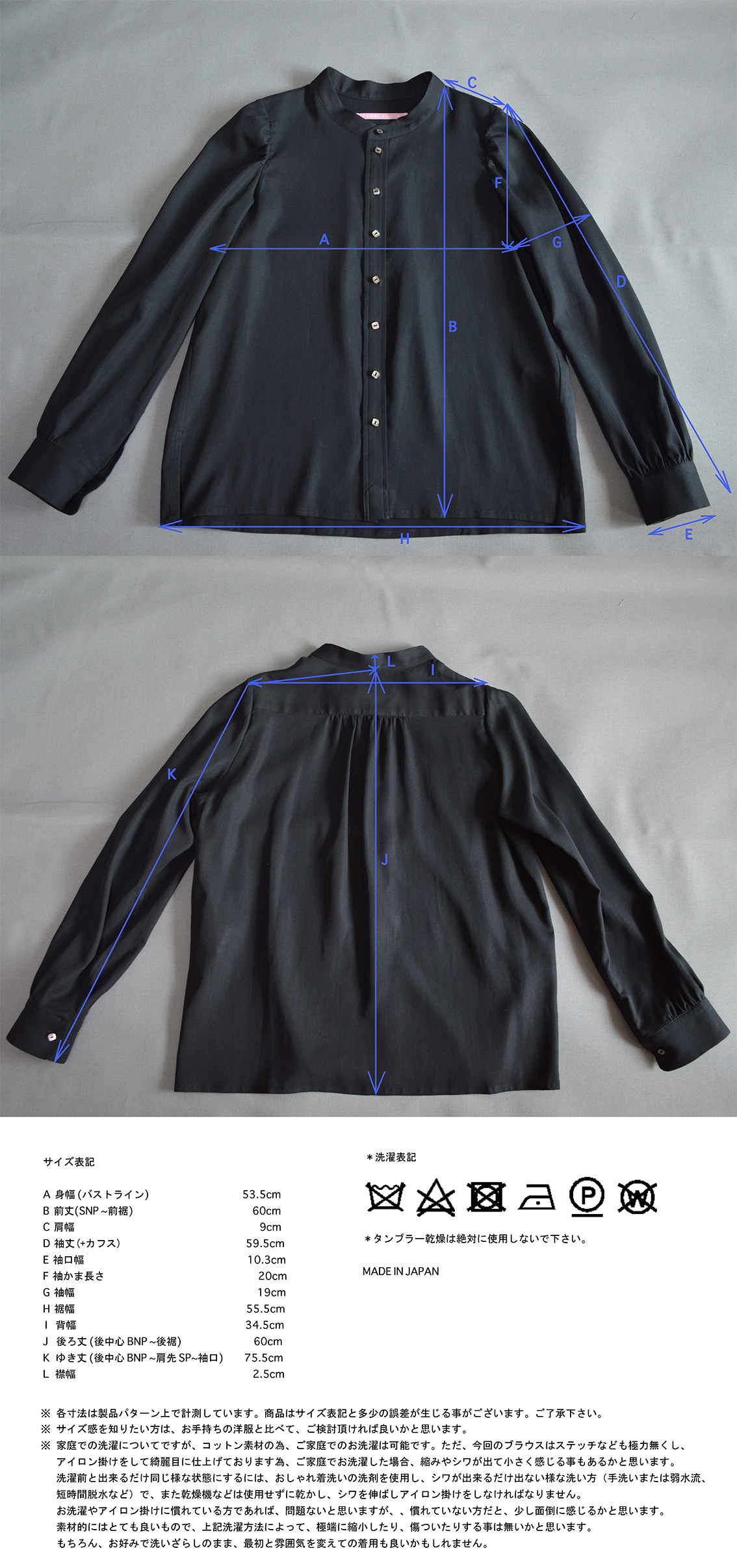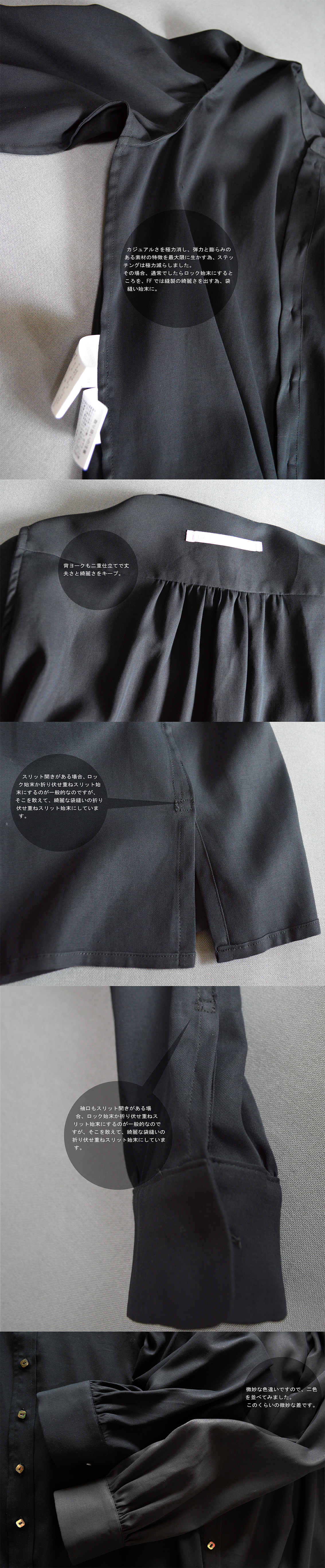 着丈、袖丈共にコンパクトな印象を出したかった為、ほんの若干短いです。でもそれが着やすさとコーディネートの容易さに繋がると思っています。 最大の特徴は、前肩にのみいれられたギャザー、通常のように肩先に入れるのではなく、前肩にのみギャザーが寄せられています。そうすると前から見てギャザーアクセントが魅力的に見えるのにもかかわらず、肩先はスッキリしているので、イノベイティブでありながらもベーシックさを保つことが出来ます。 ギャザーアクセントは袖口と後ろヨーク切り替えにも。 釦は、FFお馴染みの、角丸カットされた天然貝 黒蝶貝ボタンの一番小さいサイズを使用しています。