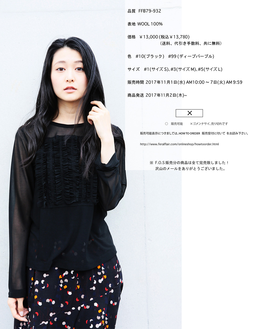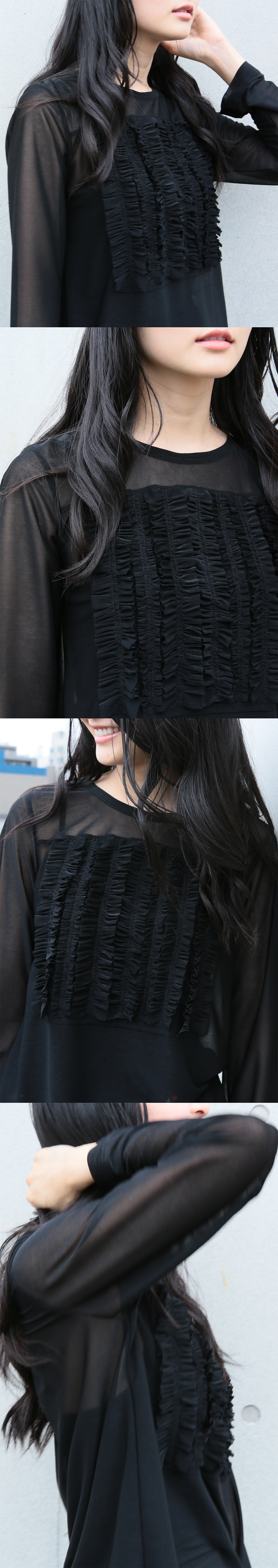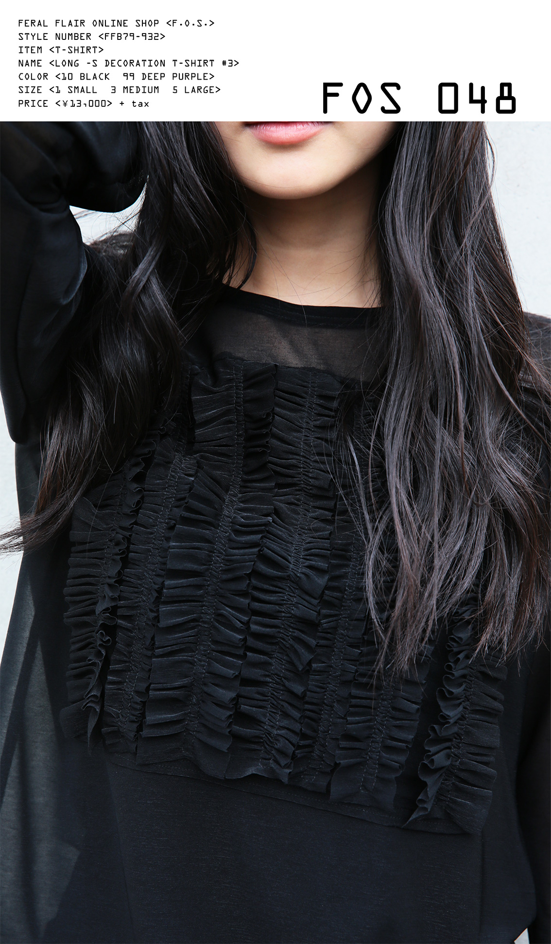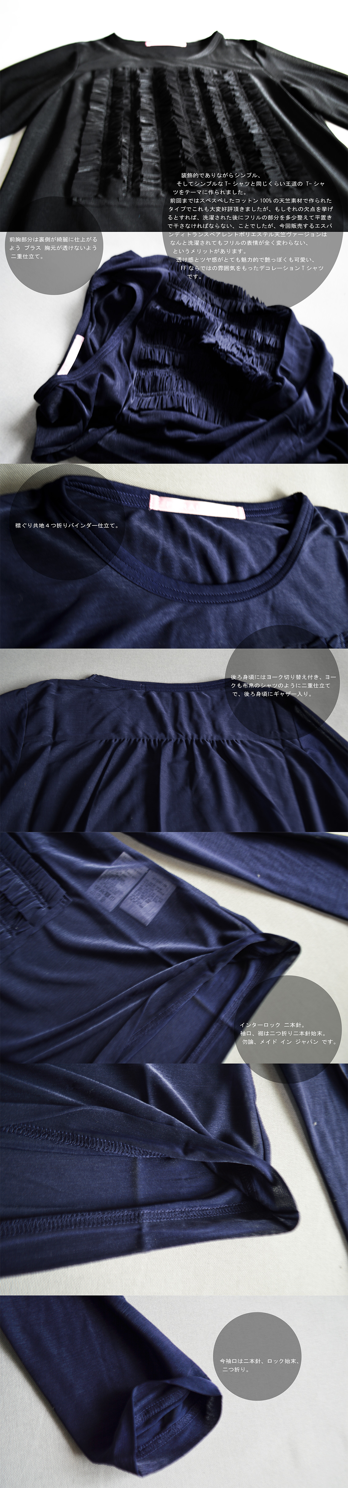 フィラルフレア オンラインショップ FOS (フォース)、第四十八弾にお届けするのは、デコレーションTシャツ第3弾、今回は透けるポリエステルフィラメント天竺素材で作られた長袖 フリル縦方向並び スクウェアデザインヴァージョンです。FOS41 FOS43 で登場したデコレーションTシャツ、装飾的でありながらシンプル、そしてシンプルなT-シャツと同じくらい王道の T-シャツをテーマに作られました。今回販売するエスパンディトランスペアレントポリエステル天竺ヴァージョンは洗濯されてもフリルの表情が全く変わらない、というメリットがあります。透け感とツヤ感がとても魅力的で艶っぽくも可愛い、FFならではの雰囲気をもったデコレーションTシャツです。