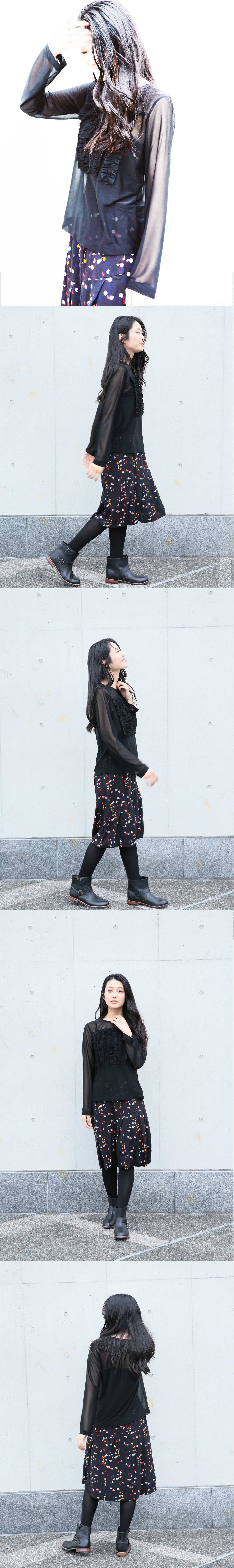 透けるTシャツですので、やはりその魅了の透け感とツヤ感を活かした着方がオススメです。中にキャミソールを着て細い肩紐を見せるのも可愛いですし、実はコレクション撮影は下着を付けずに撮影をしましたが、胸が透けることはなく、そのような大胆な着こなしも可になっています。FFコーディネートではFOS45のプリントスカートを合わせていますが、何てことのないジーンズを合わせても存在感大です。端正でサラッとした印象のT-シャツですので、シンプルなパンツコーディネートでも。黒Tに、ボトムも黒のスカートで、全身黒のコーディネートをしたとしても、キラキラしたツヤ感があるので、退屈なコーディネートには仕上がりません。ブルーパープルの方は濃紺との相性は抜群です。
