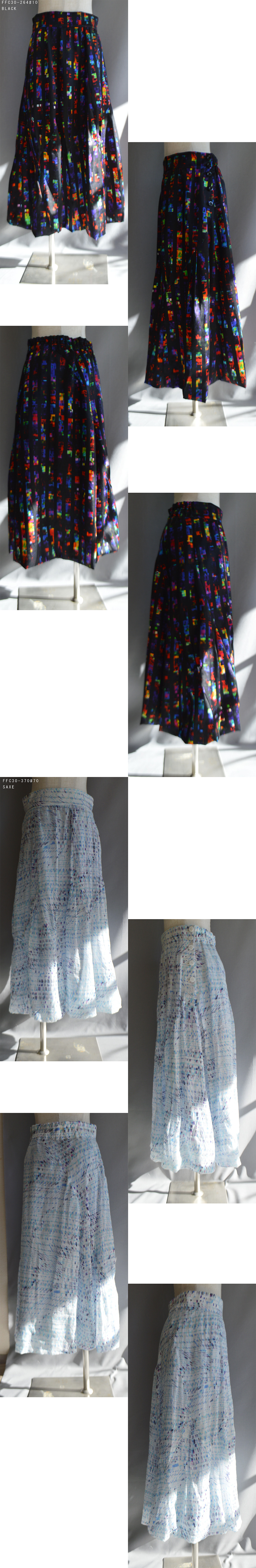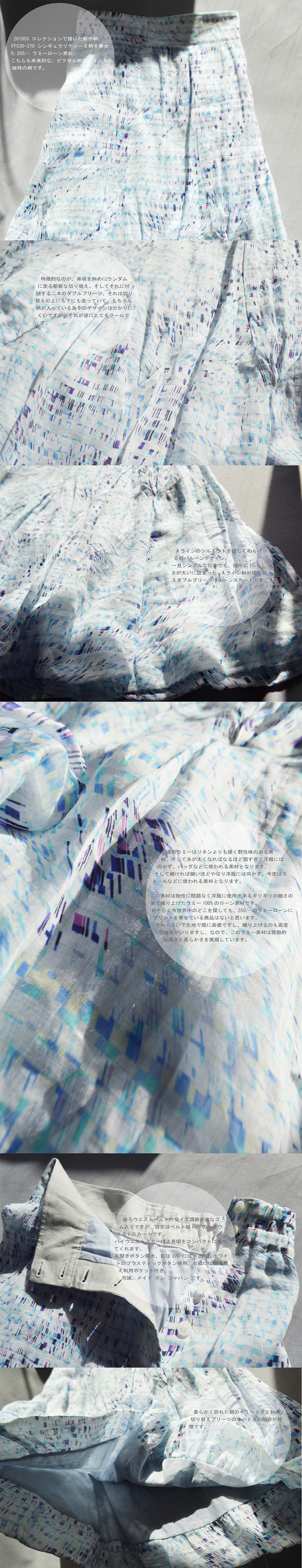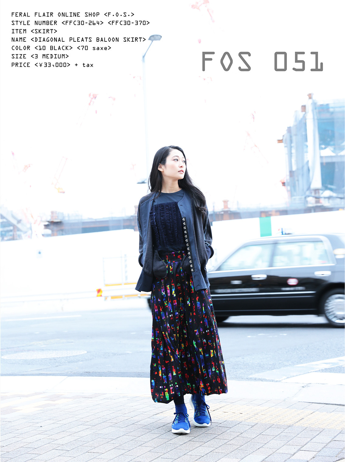 FOS第五十一弾にお届けするのは、2018S/Sコレクションの最新プリント柄を乗せたAラインスカート、 デザインは一緒で、異なる柄と素材で提案しています。 264 はデウス エクス マキナB柄を乗せたキュプラコットンブライトサテン素材、370 はシンギュラリティーB柄を乗せた250/- ラミーローン素材、どちらも特別な素材です。 そしてプリント柄とともに、特徴的なのが、身頃を斜めにランダムに走る斬新な切り替え、そしてそれに付随する二本のダブルプリーツ、それは切り替えの上にも下にも走っていて、もちろん柄が入っている為そのデザインは分かりにくいですが、それが逆にとてもクールです。 そしてAラインのシルエットを優しく和らげる裾バルーンデザインも取り入れています。後ろウエストにはゴム入りでサイズ調整もちゃんと考えています。 一見シンプルな印象でも、随所にFFらしさが大いに詰まった、 Aライン斜め切り替えダブルプリーツバルーンスカートです。