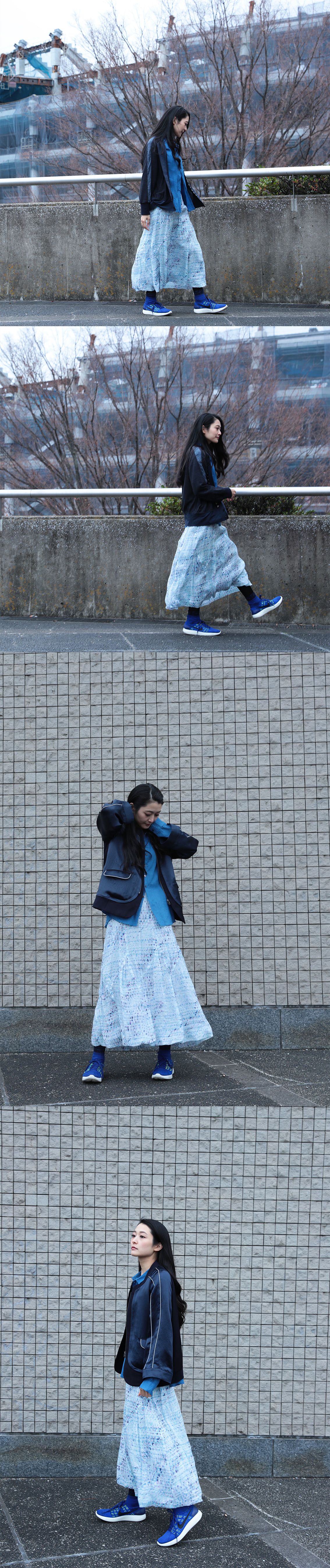 最大のデザインポイントは、 縦に斜めに入れた切り替え、更に横に斜めに入れた切り替え、更にその横の切り替え線の端と端に、上下に入れられた二本のプリーツ、それらが立体的な表情を作っています。 そしてその 斜めのシャープなデザインと対比させた膨らみのある裾バルーンデザイン。 柔らかく折れた裾のキュートさと斜め切り替えプリーツのモードさの融合が特徴です。