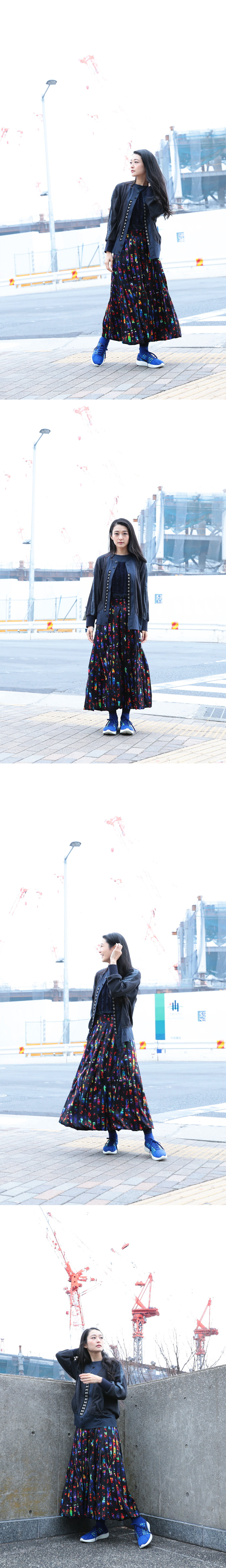 後ろウエストベルトにサイズ調節が楽なゴム入りですが、設定はベルト幅6cm のハイウエストスカートです。 ハイウエストスカーは上見頃をコンパクトに見せてくれますので、 上はコンパクトな印象の半袖T-シャツなどがおすすめです。 羽織物は、短めのボレロを合わせてもいいですし、同時販売のショートブルゾンとも、もちろん合います。 足元は、撮影で合わせたようなスニーカーでスポーティーに決めるのもあり、サンダルでガーリーに決めるのもいいと思います。