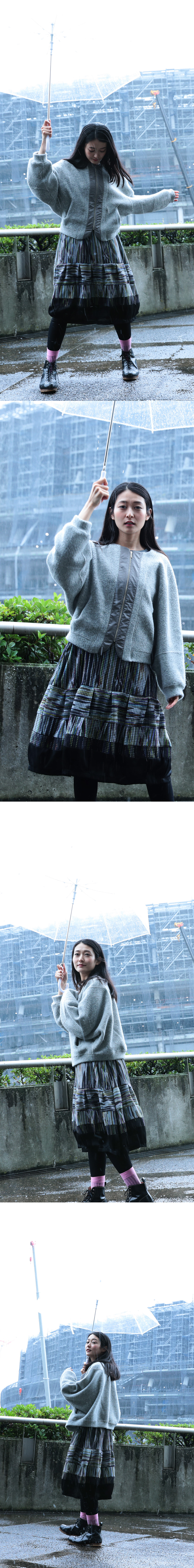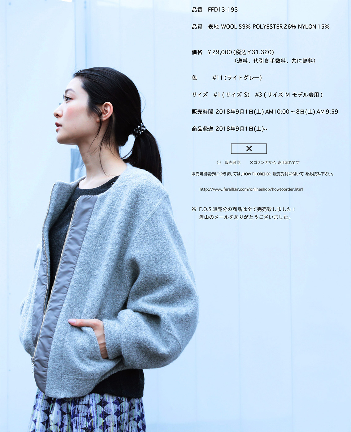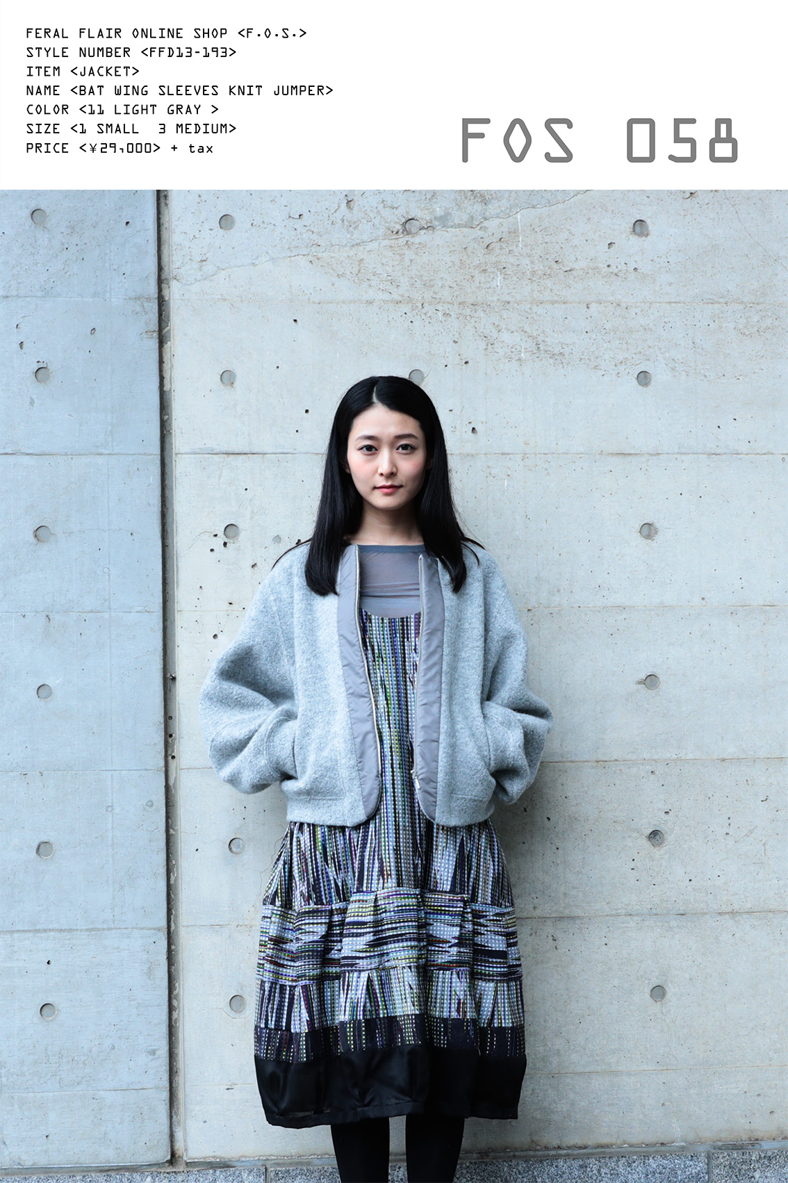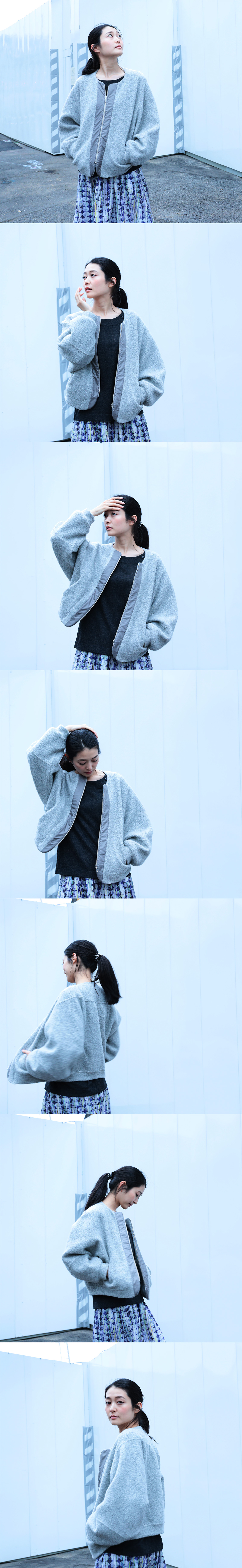 FOS第五十八弾にお届けするのは、「ニットカーデのように簡単に羽織れる軽く使いやすいニットブルゾン」をテーマに作った、フロントの白金色の金属ファスナー、前端の白金が混じったようなグレー色光沢タフタ、そしてボデイーのもこもこした羊の毛のようなトップライトグレーとのコントラストが美しいニットショートブルゾンです。第一印象は十分な厚みと暖かさがあるのにとても軽い。ニットカーデのように丸めて収納してもシワにならない。そしてニットカーデはその上にさらにアウターを着る印象ですが、これは完全にアウターの顔。秋冬にとても活躍するアイテムになっています。 前端の配色切り替えと共に特徴的なのが、袖。バットウィングスリーブのようなとても下がった袖付け。その袖付けラインは前から見るとセットイン切り替えのように見えますが、袖付け線は前身頃袖山を通り後ろに回ると何とそのままヨーク切り替えに続いているデザイン。しかも前側にあった袖付け線は後ろにはなく、後ろ袖は身頃と続く切り替えのないドルマンスリーブデザインに。 そしてその後ろヨーク切り替えを利用してその後ろ身頃にはギャザーを入れたデザインに。 裾、袖口は、リブを接ぐ際に使用する仕様を共地を使って縫製しています。 無駄な切り替え線はなく全てのカッティングをいかしきるデザインに仕上がっています。 洋服の裏側の切り替え線縫い代は、ぼこぼこしないように縫製後、さらに縫い代を伏せるカヴァーステッチ入れて綺麗に仕上げています。そしてポケットは、FF がニット物に多用しているお馴染みの、くりぬきポケットが左右に付けられています。 キュートなポケット、計算されたカッティングライン、綺麗な縫製始末、そして美しい配色切り替え、など随所にFF らしさ満載です。
