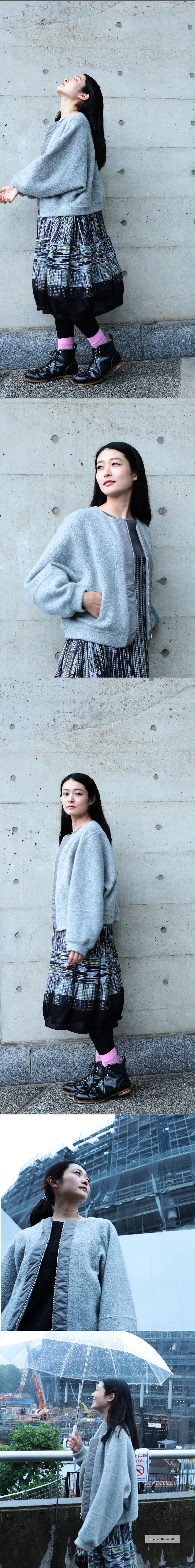 あまり上に羽織れないような少し下がり目の袖付けのデザインセーターの上からも羽織れるイメージです。 凝ったセーターをお持ちのお客様にもオススメ。少し寒くなった時、裏地付きのキチッとしたジャケットではちょっと堅苦しさを感じる時、大活躍してくれるのがこのニットブルゾンです。色も控えめなライトグレーなので合いやすい色合いは多いです。派手めなプリントにも合いますし、シックな黒とも相性はいいです。