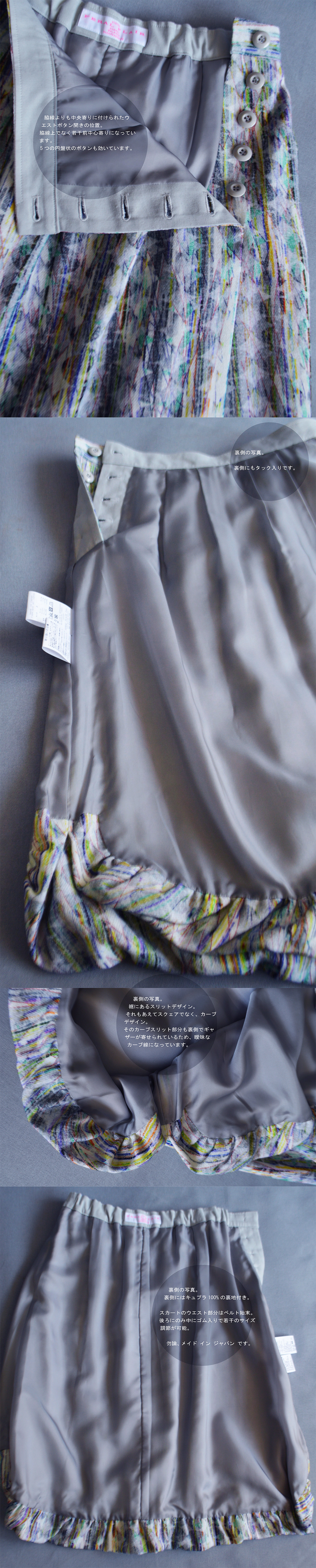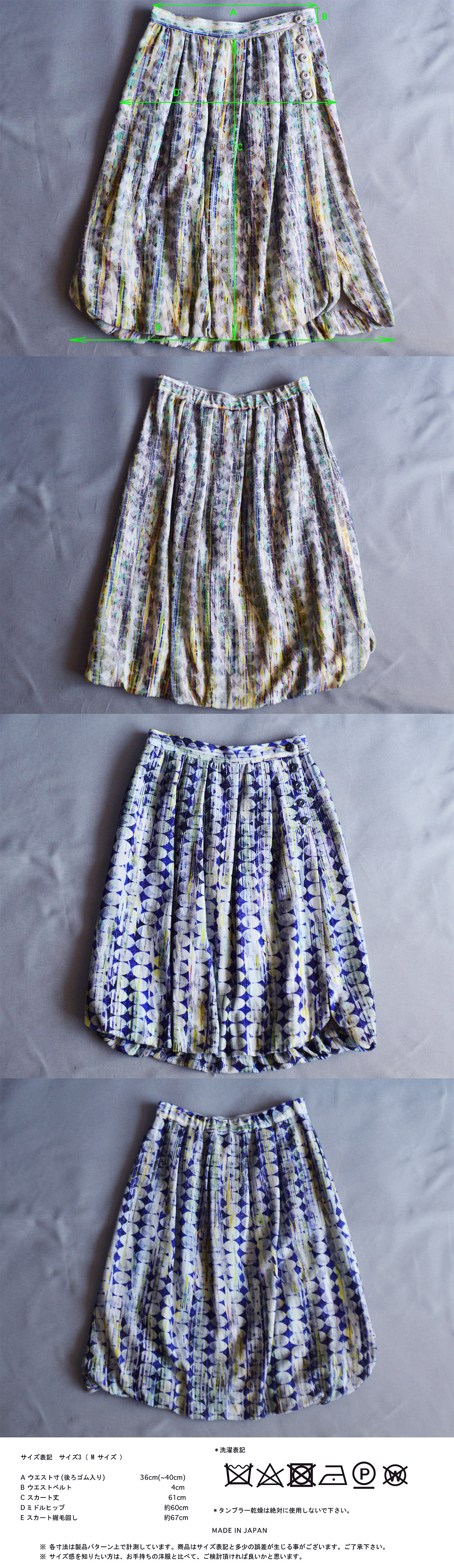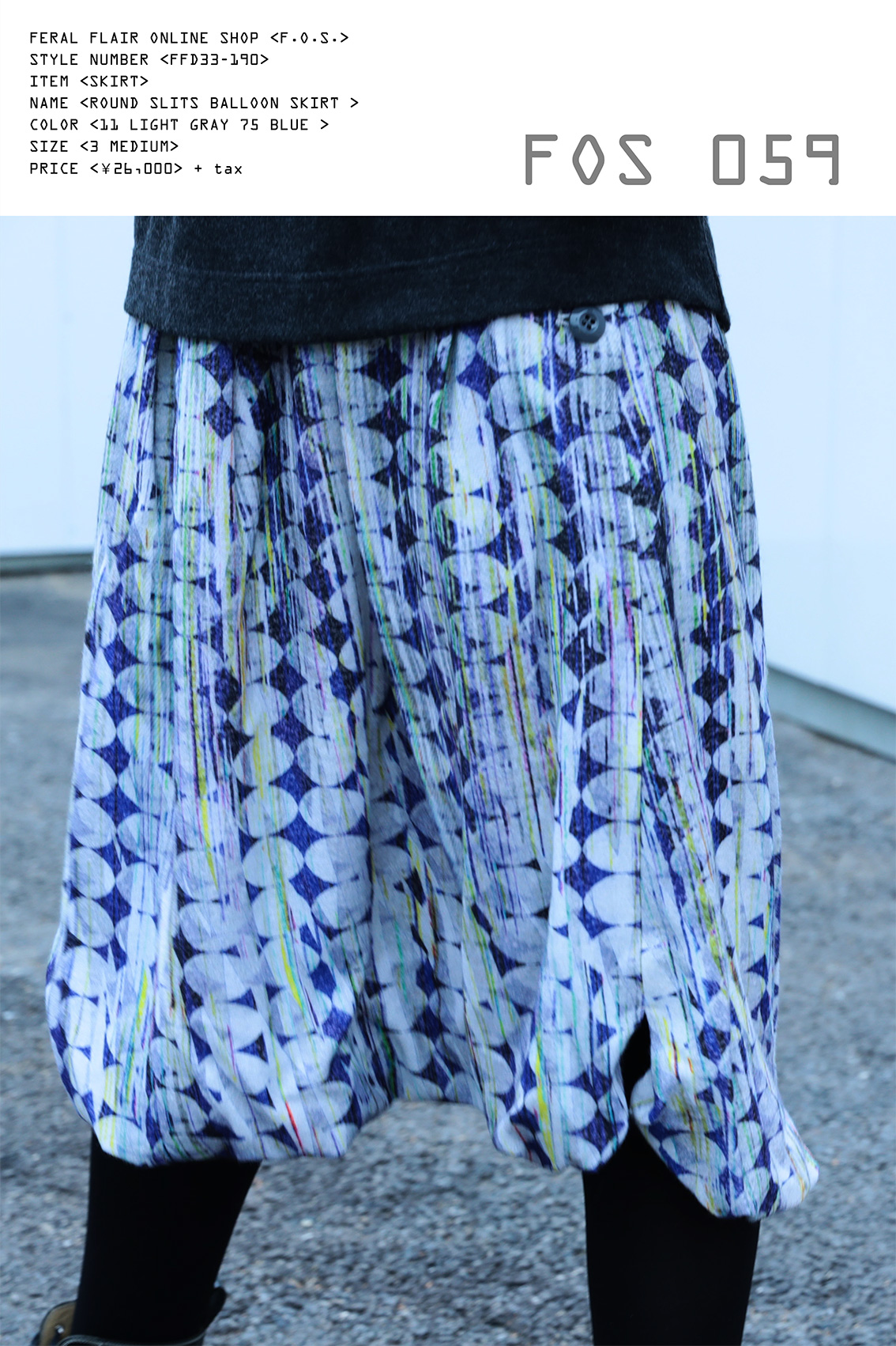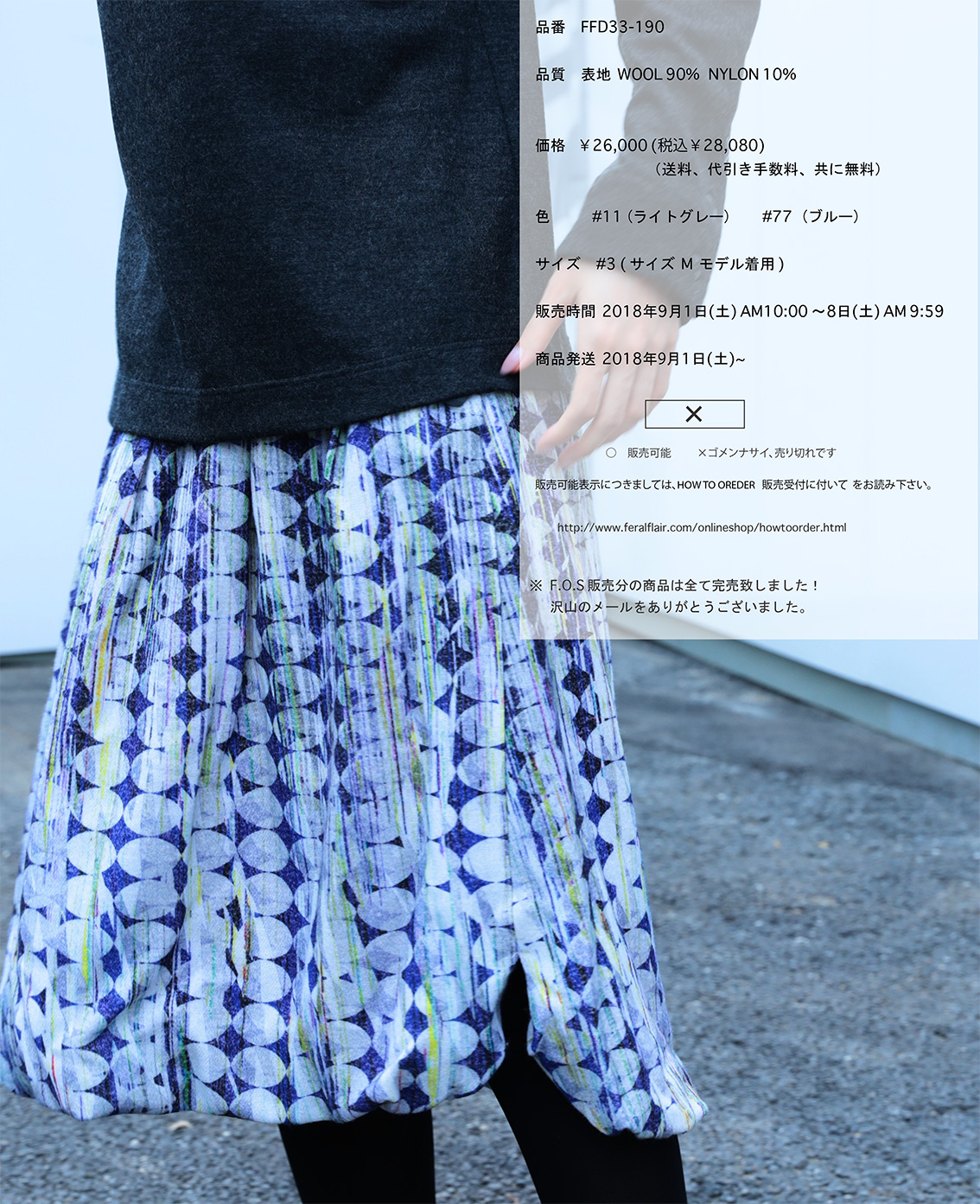 FOS第五十九弾にお届けするのは、FERAL FLAIR 2018/2019 AUTUMN & WINTER COLLECTION 新作プリント柄、パラダイム シフト プランタン柄 エテ柄を使用した、バルーンデザインの膝下丈のスカートです。 言わずと知れたFF オリジナルプリント柄。たくさんの要素が混じり合う独特の図案とその色合い。音を、旋律を感じさせ、自然を、吹き抜ける風を感じさせ、移り変わる季節を感じさせる柄を試みたプリント柄。 ブルー系は夏のイメージ、ベージュ系は春のイメージ。一般的な何柄、と容易な形容詞で言い表せない独特なプリント柄。 スカートのウエスト部分はベルト始末。後ろにのみ、中にゴム入りで若干のサイズ調節が可能。 ベルトに接がれたスカート身頃には深いタックとギャザーが入ったデザイン、そこから派生したドレープは、裾にまで伸び、裾バルーンデザインに。そのバルーンデザインヘムは、裏側に施されたギャザーで構成され、曖昧な裾線を形成しています。 そしてもう一つ特徴的なのが裾にあるスリットデザイン。それもあえてスクェアでなく、カーブデザイン。 そのカーブスリット部分も裏側でギャザーが寄せられているため、やはり曖昧なカーブ線になっています。 両サイドにそのカーブスリットが入っていますが、右脇は脇線ピッタリにそのスリットが入っているのに対し、左側は脇線よりも中央寄りに付けられています。これは歩いた時に左足にちょうど当たる位置です。 歩いた際に左脚がそのスリットに当たり開くデザインになっています。そのスリット切り替え線に合わせウエストボタン開きの位置も脇線上でなく若干前中心寄りになっています。5つの円盤状のボタンも効いています。 この絶妙なアシンメトリーさがとてもキュートです。 スカート丈は履きやすい61cm。 膝下丈が大人っぽい印象を与えてくれます。