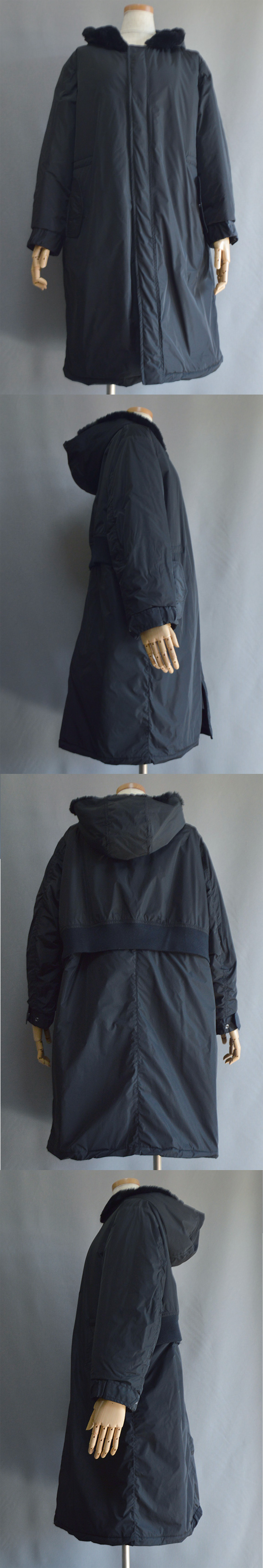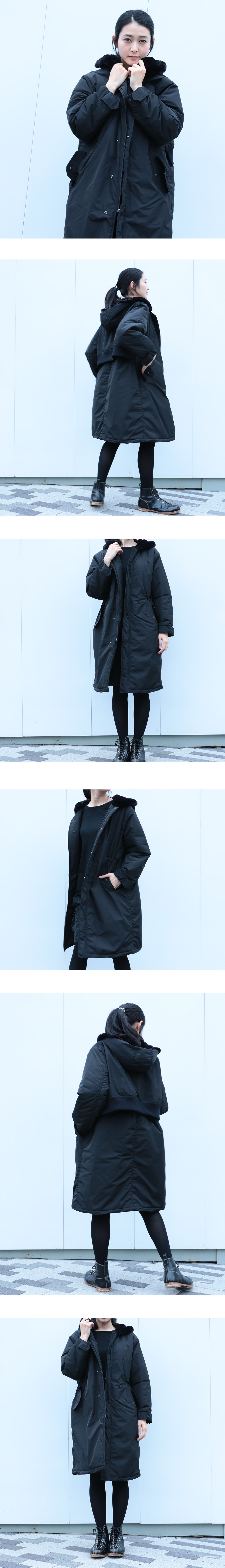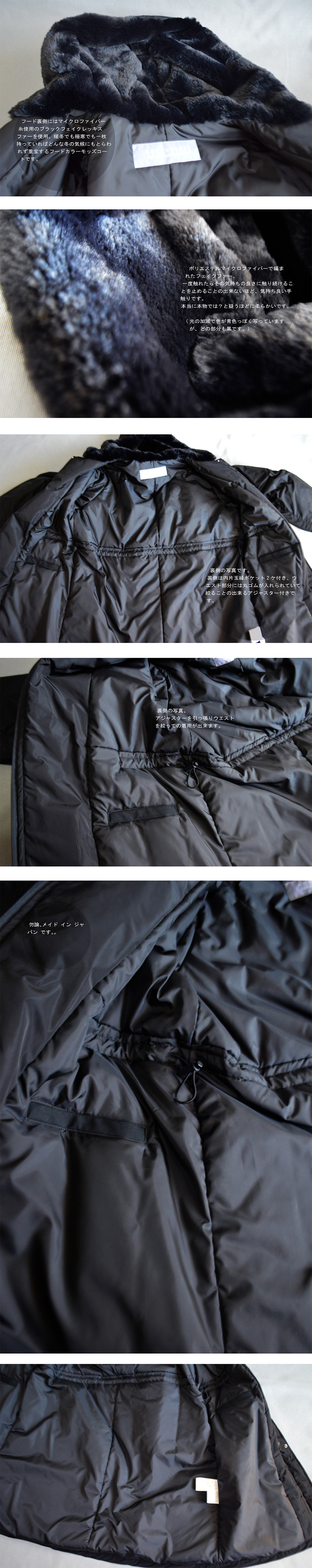 FOS第六十弾にお届けするのは、ポリエステルフィラメント糸を高密度で織り形成された形状記憶メモリータフタ、その素材を使用した、中綿入りの分量感のあるフードカラーモッズコートです。 デザイナーが以前から公言しています一番好きなコートの形である、モッズコート、4.5年前に第一弾を作りましたが、今回は新型、第2弾です。 一言で言い表しますと、FFらしいハイブリッドデザイン、前から見ますとフードカラーのコートですが、後ろはまるでジャンパーを重ね着しているかのようデザイン。 素材は上品な光沢ある美しいブラックのポリエステル100%の形状記憶メモリータフタ、そしてフード裏側には本物のレッキスファーを再現した風合いと柔らかさの、マイクロファイバー糸使用のブラックのフェイクレッキスファーを使用。 とても軽くシワにもならず持ち運びも便利で、暖冬でも極寒でも、一枚持っていればどんな冬の気候にもとらわれず、重宝するアイテムです。