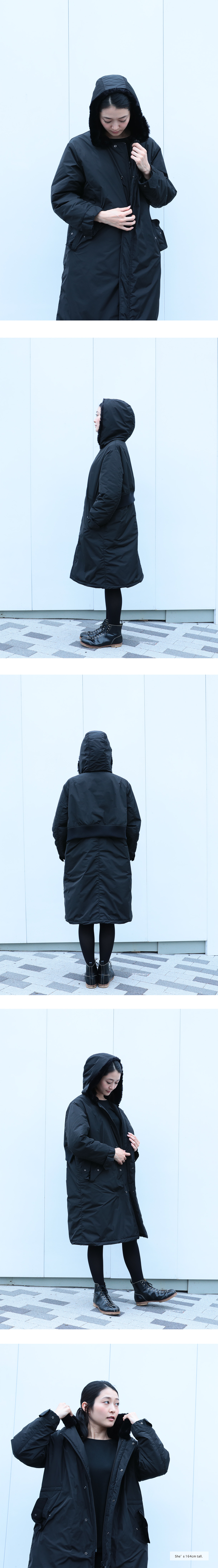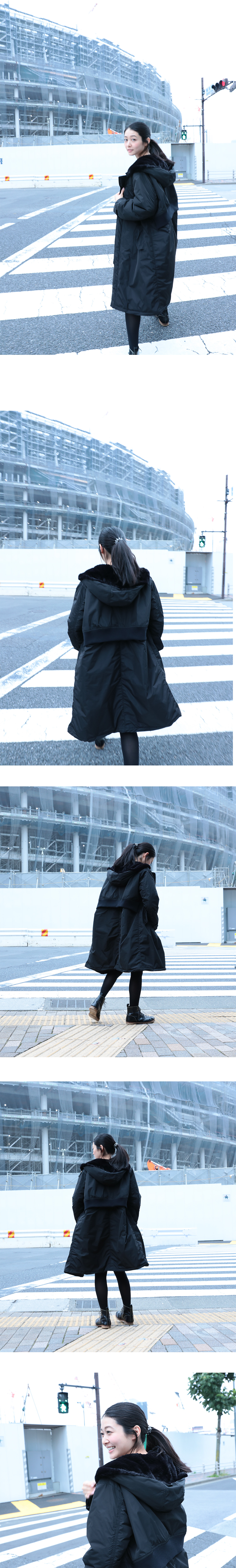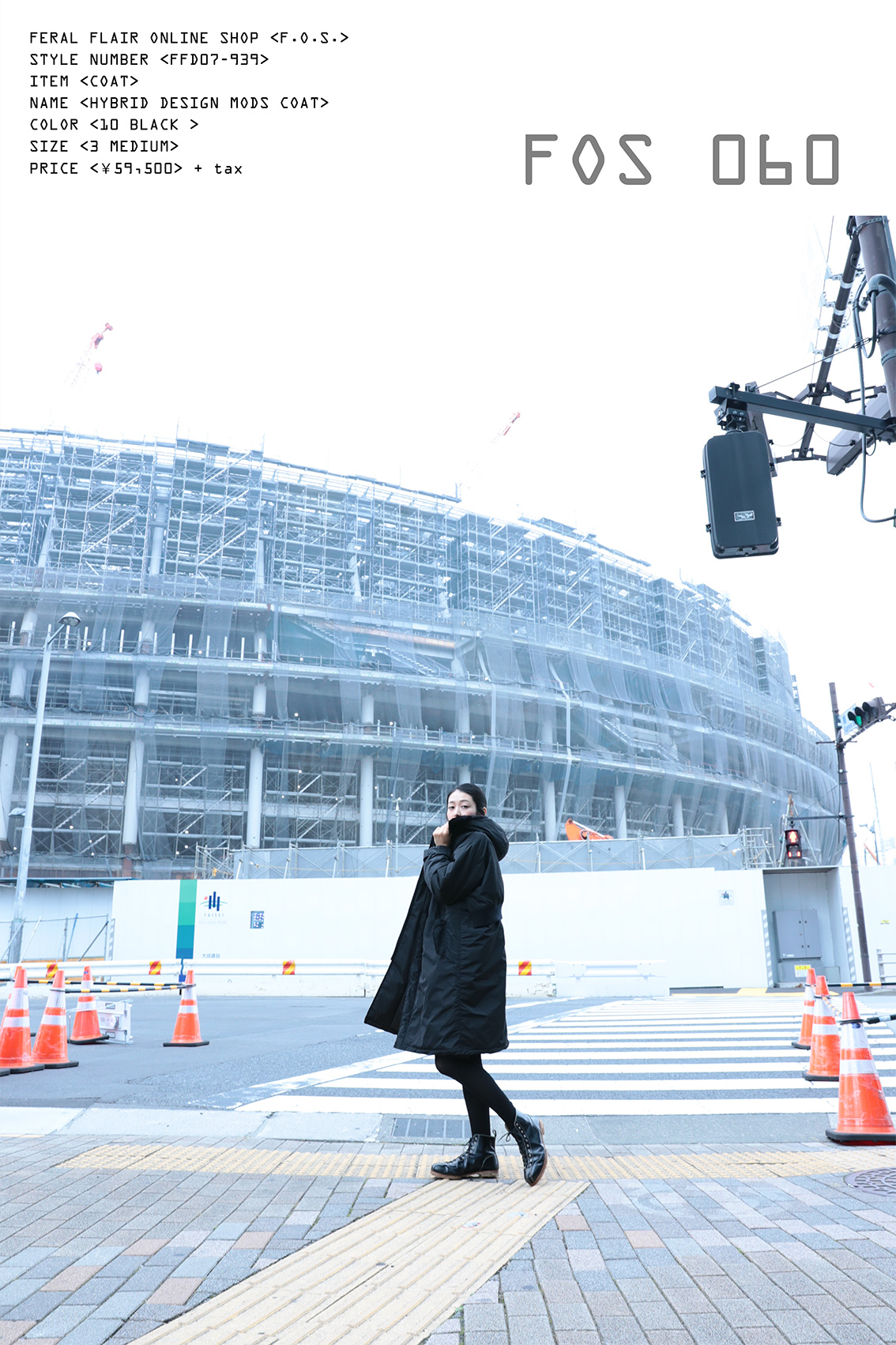 FOS第六十弾にお届けするのは、ポリエステルフィラメント糸を高密度で織り形成された形状記憶メモリータフタ、その素材を使用した、中綿入りの分量感のあるフードカラーモッズコートです。 デザイナーが以前から公言しています一番好きなコートの形である、モッズコート、4.5年前に第一弾を作りましたが、今回は新型、第2弾です。 一言で言い表しますと、FFらしいハイブリッドデザイン、前から見ますとフードカラーのコートですが、後ろはまるでジャンパーを重ね着しているかのようデザイン。 素材は上品な光沢ある美しいブラックのポリエステル100%の形状記憶メモリータフタ、そしてフード裏側には本物のレッキスファーを再現した風合いと柔らかさの、マイクロファイバー糸使用のブラックのフェイクレッキスファーを使用。 とても軽くシワにもならず持ち運びも便利で、暖冬でも極寒でも、一枚持っていればどんな冬の気候にもとらわれず、重宝するアイテムです。