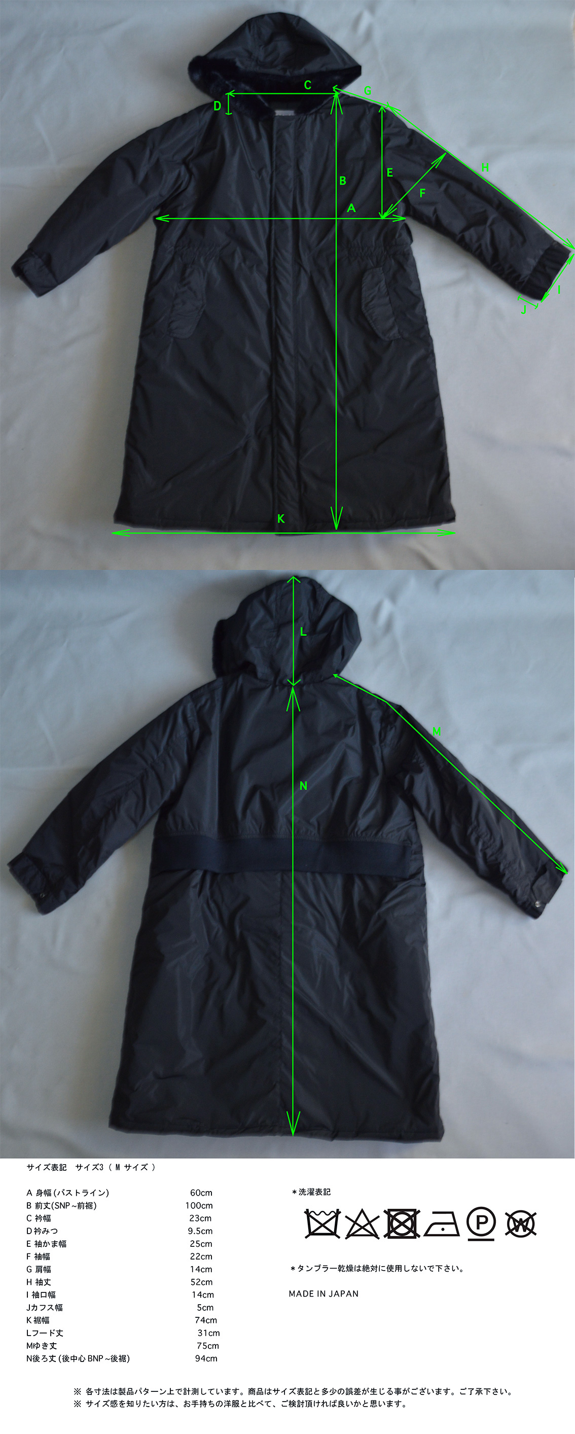 最大の特徴はやはり後ろ姿です。 MA-1 を着ているかのような後ろ姿、そしてそのジャンパーのような太いリブのついた後ろ見頃裾をめくると、下見頃ウエストには中に丸ゴムを通しているステッチが覗きます。裏側のアジャスターで絞ることのできる部分が内側にデザインされています。 全ての接ぎ線はギャザーが寄せられているような表情を持ち、中綿入りのメモリータフタの質感と相俟って存在感バツグンです。 前端はコイルファスナーとドットボタン開き。左右腰イラスティックが入れられた袖口タブにもアジャスター用のドットボタン付き。片玉縁ポケットのフラップにもドットボタン付きです。 裏側は内片玉縁ポケット2ケ付き、ウエスト部分には丸ゴムが入れられていて絞ることの出来るアジャスター付きです。 とにかく暖かく軽いです。