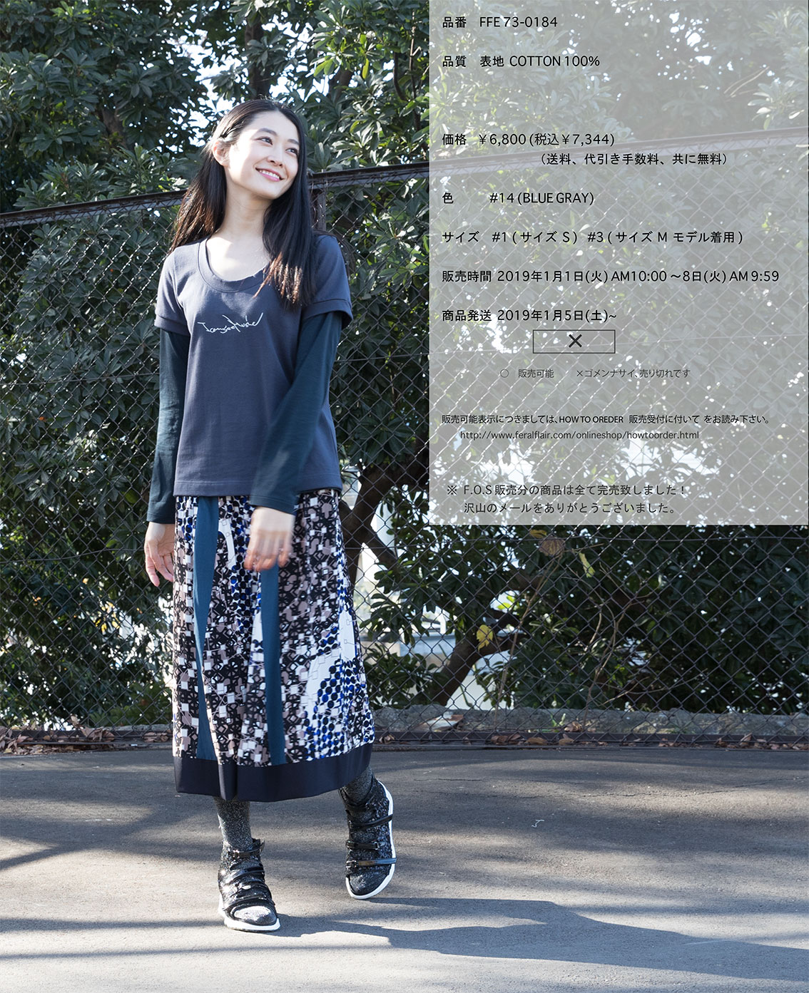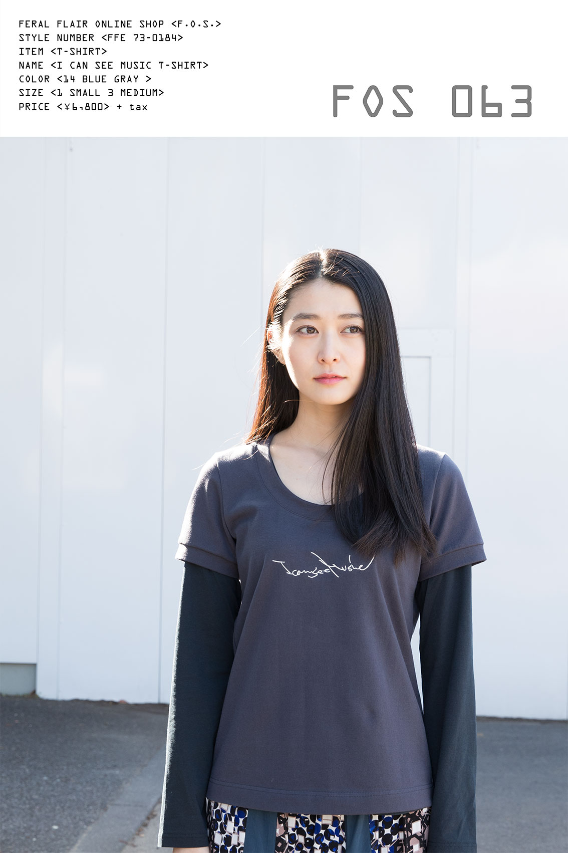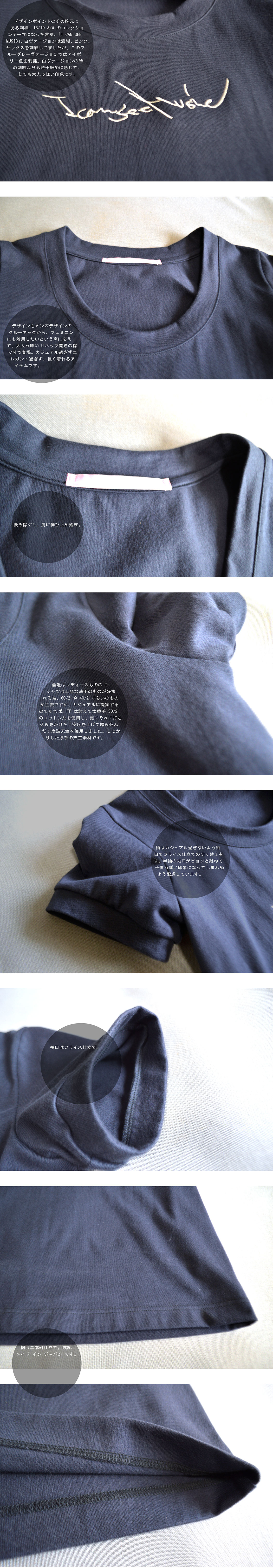 FOS第六十三弾にお届けするのは、THE 9th SEIBU POP-UP SHOP で、FFデザイナー男性のため着用する FF アイテムがなく急遽作成したメンズT-シャツ、それを購入したいと多くの声を頂き急遽受注生産、そのお声はバイヤー達にも届き更に展示会で再生産。その際、T-シャツは白のみの販売でしたが、今回は多くの声にお応えして、新色のブルーグレーヴァージョンでの登場です。 デザインもメンズデザインのクルーネックから、フェミニンにも着用したいという声に応えて、大人っぽい Uネック開きの襟ぐりで登場。カジュアル過ぎずエレガント過ぎず、長く着れるアイテムです。 デザインポイントのその胸元にある刺繍、18/19 A/W のコレクションテーマになった言葉、「I CAN SEE MUSIC」、白ヴァージョンは濃紺、ピンク、サックスを刺繍してましたが、このブルーグレーヴァージョンではアイボリー色を刺繍。白ヴァージョンの時の刺繍よりも若干細めに感じて、とても大人っぽい印象です。 使われている素材は、しっかりした厚手の度詰天竺素材なので、耐久性の意味でも長く着れるアイテムです。 ( 勿論洗濯機洗い可能ですが、その際はどうかネットに入れての洗濯をおすすめいたします。その方がもっと長く着用出来ます。) お値段もサービス価格になってますので、この機会に、是非!