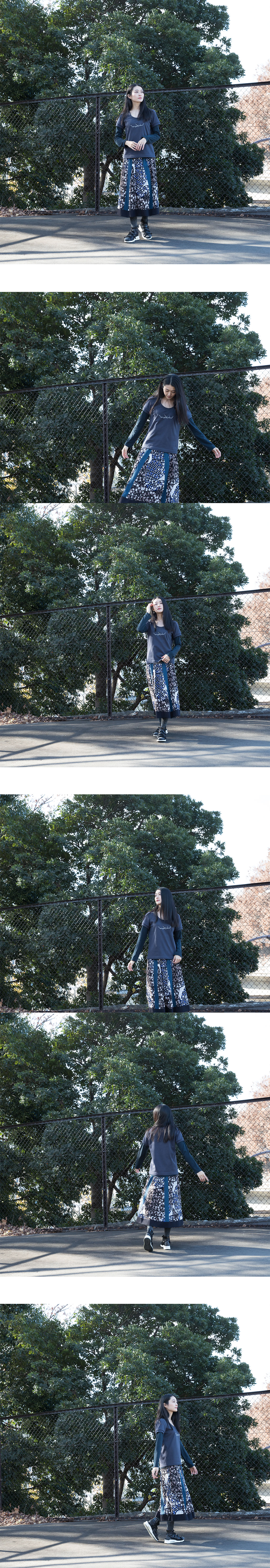 最近はレディースものでは T-シャツは上品な薄手のものが流行りで、60/2 や 40/2 ぐらいのものが主流ですが、カジュアルに提案するのであれば、FF は敢えて太番手 30/2 のコットン糸を使用し、更にそれに打ち込みをかけた(密度を上げて編み込んだ)度詰天竺を使用しました。しっかりした厚手の天竺素材です。