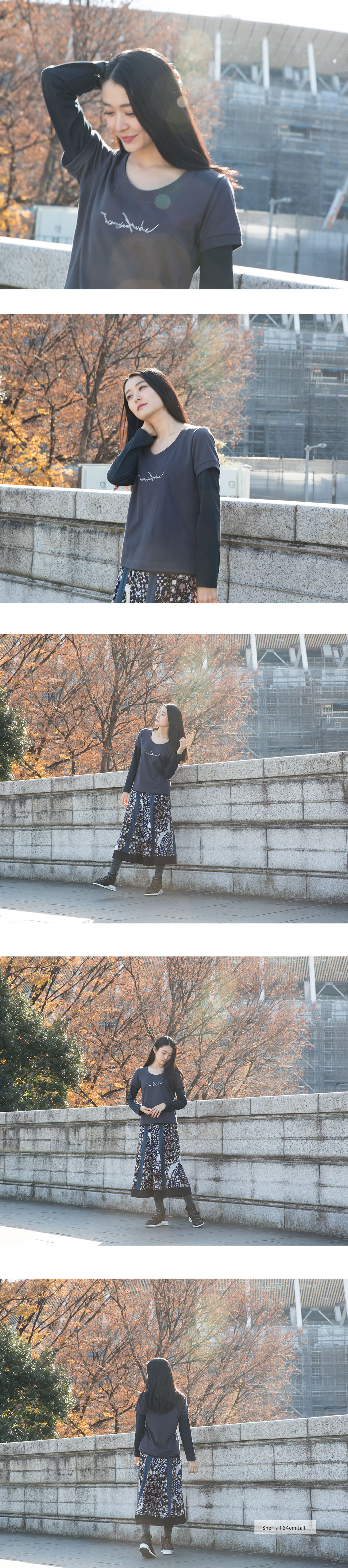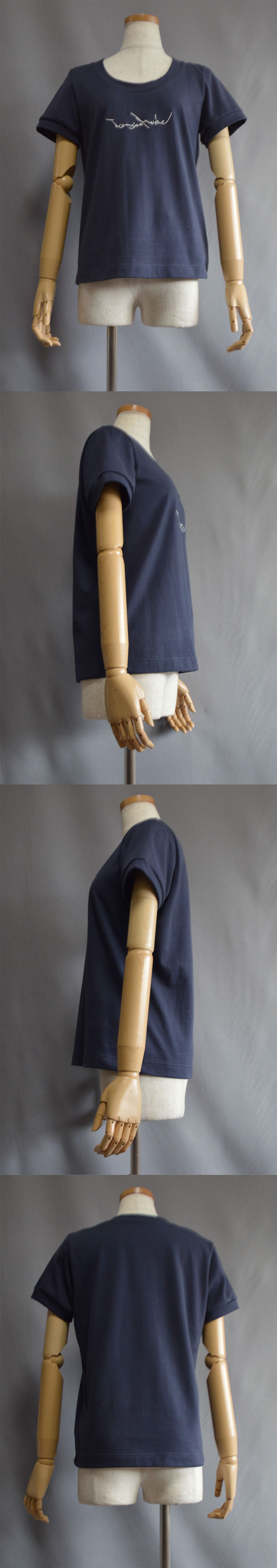 FOS写真では長袖T-シャツを下に重ねて着用していますが、もちろん夏には是非一枚で大人っぽく着て頂きたい。上にジャケットを羽織り開いた胸元から刺繍を覗かせるスタイルもクールです。 ブルーグレー色はちょっと男の子っぽいお色ではと思うかもしれませんが、このお色を女性が着られるのもまた一味違った感じで、素敵です。