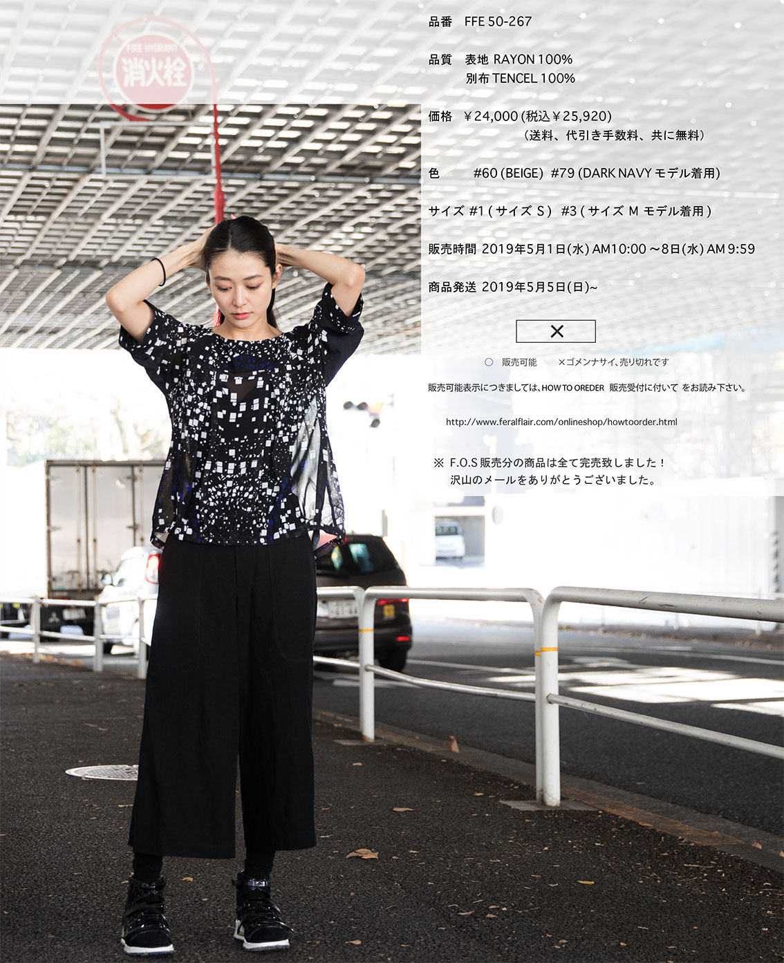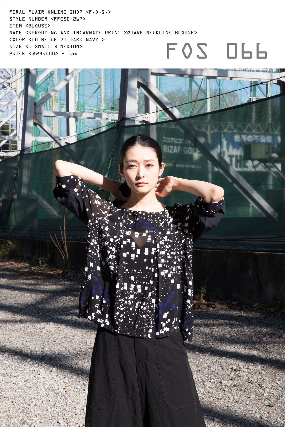 FOS第六十六弾にお届けするのは、FERAL FLAIR 2019 SPRING & SUMMER COLLECTION 新作プリント柄、スプロウティング柄、インカネイト柄を使用したスクウェアネック開きのブラウスです。 袖はラグラン切り替えの7分丈、袖口カフス付き、前身頃にはヨーク切り替えがあり、その接ぎ目から裾に向かってボックスプリーツが走るデザイン。 そして裾にもボックスプリーツとプリーツがあり、身頃はその上下のプリーツに挟まれている状態です。 そのプリーツに身頃が挟まれている状態は後ろ身頃も同じで、通常でしたら身頃がその分量感のある状態なので着膨れしてしまいそうですが、素材が重みとドレープ性のあるレーヨンフィラメントジョーゼットの為、それを防いでくれていて、カジュアルさよりもややエレガンスさが勝っている印象です。 そして、後ろ袖側には、無地の配色切り替え有り。 非常に柔らかなマットな質感のテンセルポプリンが効いています。 分量感があるのにスッキリとした落ち感で、動くたびに軽やかに揺れ動きます。