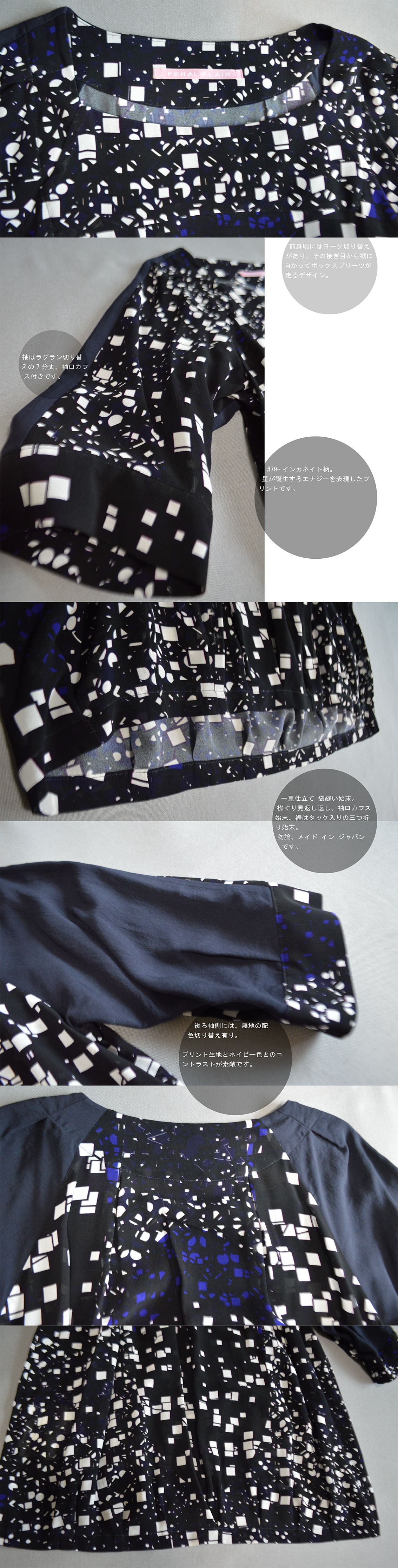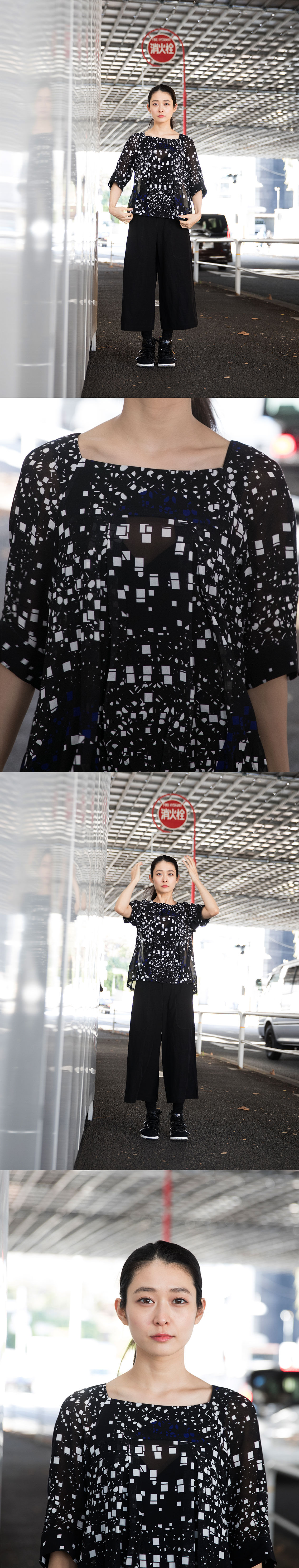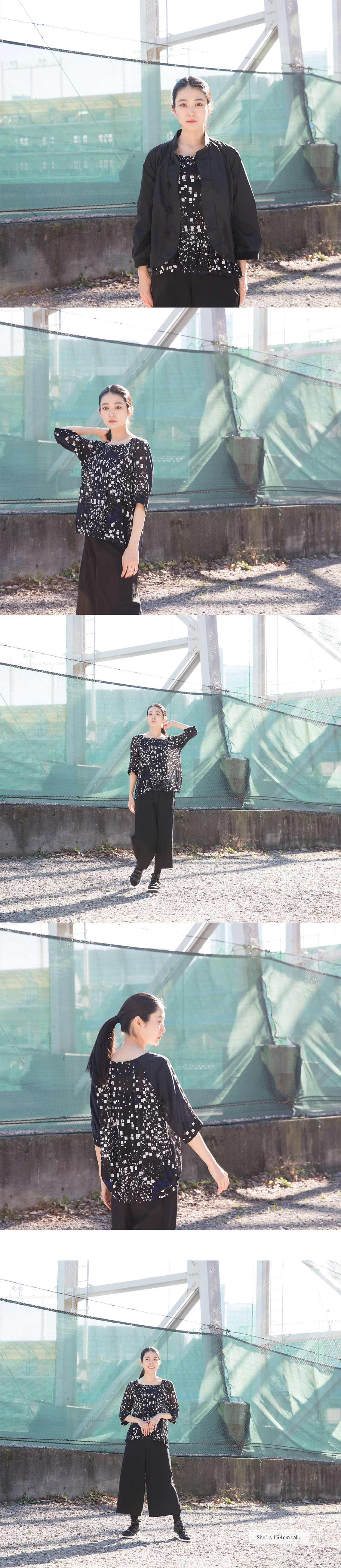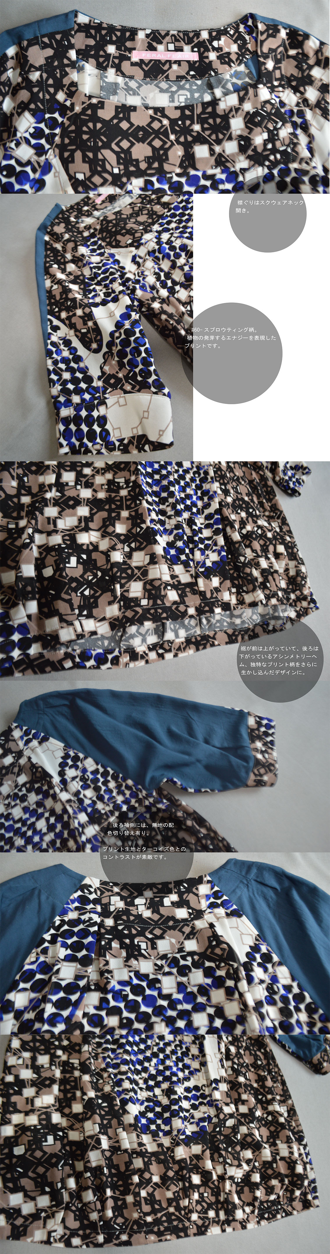 最大の特徴は、身頃に上下プリーツを入れ十分な分量を取りながらもスッキリと魅せるカッティングとその素材感、そして裾が前は上がっていて、後ろは下がっているアシンメトリーヘム、独特なプリント柄をさらに生かし込んだデザインに。