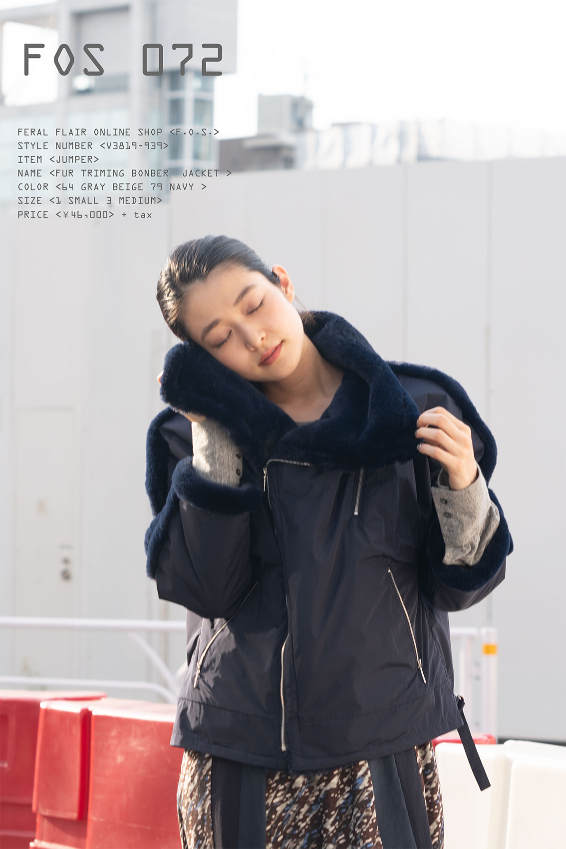 FOS第七十二弾にお届けするのは、今回19/20A/Wコレクションでアイコン的デザインになったフェイクファーをトリミングしたようなディティール、それはアルパカモッサ素材のコートやジャケットに使用されましたがそのジャケットを中綿入りのポリエステルメモリータフタに置き換えられたヴィジョネアヴァージョンが今回ご紹介するFOS72 になります。 シワになりにくく軽いので持ち運びにも大変便利です。そして暖冬でも寒冬でもカヴァーしてくれる優れものです。 11th SEIBU POP-UP で限定商品として販売しサイズ欠品になるなど大変好評をいただきました。ただほかでは販売はされていませんでしたのでお買い上げが叶わなかったり買いそびれたお客様のために今回、FOS での販売が決まりました。 お色は二色展開。FFではめずらしいグレーベージュヴァージョンとネイビーヴァージョンです。素材はFFのお気に入り、ヴィジョネアではおなじみのポリエステル100%の形状記憶メモリータフタ。上品な光沢ある美しいグレーベージュとネイビー、素晴らしい素材です。襟裏、前見返し、接ぎ目境部分にはマイクロファイバーでレッキスファーをリアルに近い風合いと柔らかさで再現したフェイクレッキスファーを使用。サイズも1と3をご用意。 あとサイズ表を見ていただくとお分かりになると思いますが、ドルマンスリーブデザインのためもあり通常のFF 商品よりも若干大きめです。 一枚持っているだけで容易に便利にスタイリッシュなスポーツテイストの着こなしが可能です。