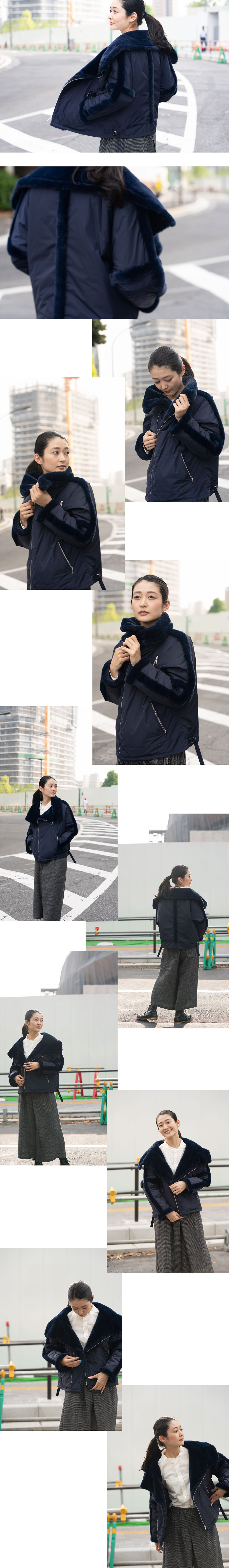 最近、街中でよく見る、上をヴェリューミィーなトップスにして下をスキニーなどの細めのパンツなどで組み合わせているコーディネート、その着方にもバッチリ合います。スカートを合わせる時も落ち感のある(広がらないしぼむ感じ ジョーゼットなどの)素材のロングスカートなどがおすすめです。 着用してももちろん軽く羽織った表情でもとても迫力があり、寒い時は上までファスナーで閉じると、首元はマフラーいらずの暖かさです。