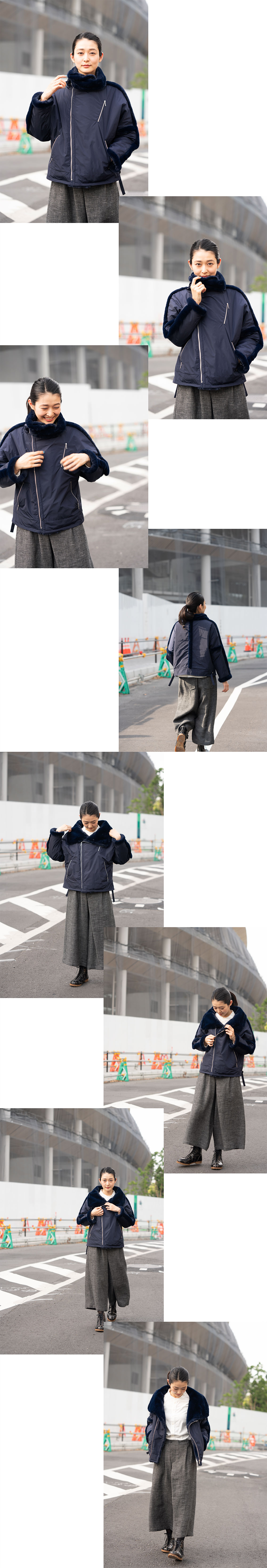 最大の特徴はやはりフェイクファーをトリミングしたようなディティールです。 肩線、袖付け線、袖口、後ろ中心接ぎ線とフェイクファーを大胆に挟み込み、さらに裏衿、前見返しにも使用しました。グレーベージュヴァージョンはタフタのツヤ感があるマットな色合いとそのフェイクファーとの色合いが美しいです。そして色合いに合わせて金属のファスナーの金属部分のお色も変えてます。グレーベージュに対しては黄みのある白金色のファスナーを、ネイビーに対してはシルバーニッケル色のファスナーを使用しています。