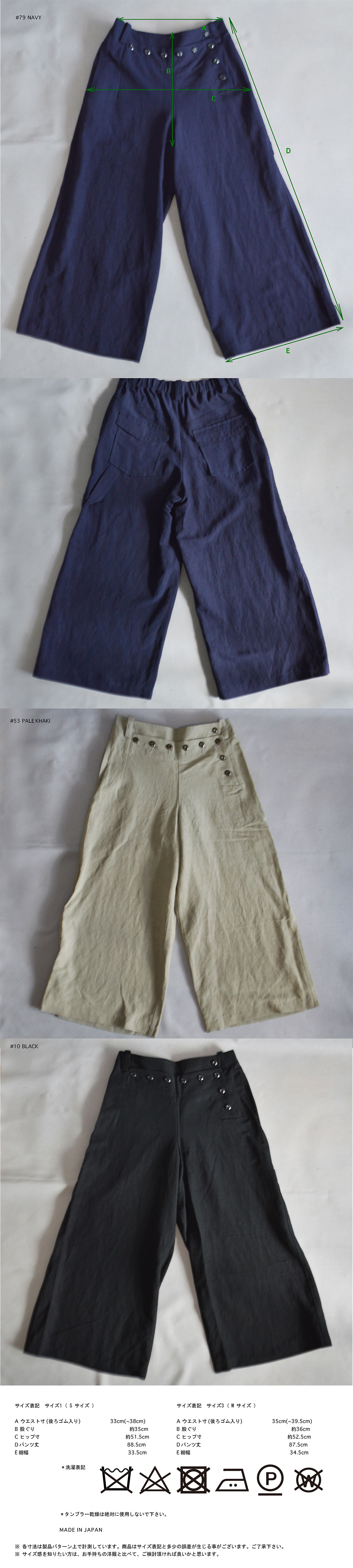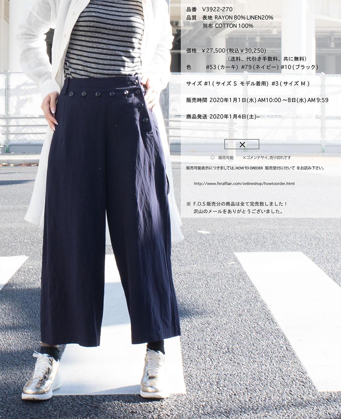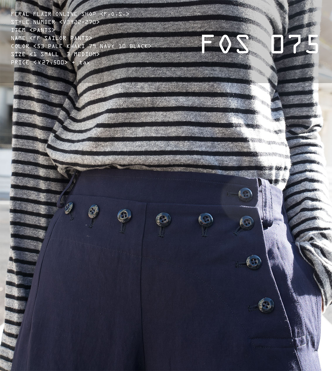 FOS第七十五弾にお届けするのは、FF が考えるシンプル且つ究極デザインを目指したセーラーパンツです。 毎回パンツにはとても定評をいただいていますが、今回は一層気合入れて取り組みました。 正直、セーラーデザインパンツ自体それほど好みのテイストではありませんが、でもそれはもしかすると世の中に出回っているデザインのセーラーパンツに対して単にそれほど好みではないのかもと思い始めたところからスタートしました。 例えばボタンを強調しホワイトやゴールド釦を配し過剰にマリンテイストを強調するのではなくもっと自然なテイストでセーラーパンツを作れないものかと思いスタートしました。 出来るだけ自然なデザインで、ただデザインはスッキリしていても内部はとても複雑な構造になっています。 そのせいで縫製が大変なのは十分承知で、究極のセーラーパンツに挑んでみました。 素材は19SS で初お披露目しその後もとても好評のヴィスコースリネン ウェザータンブラー素材。 高密度の生地で厚さは中肉、混率はレーヨン80%リネン20%、一裏仕立てですのでスリーシーズンで着用可と思われます。 パンツシルエットはクセのないワイドなストレートシルエット。 後ろウエストベルトにはゴムが入り若干のウエスト調節可能です。 両脇縫い目に切り替え利用ポケット付き、両後ろ身頃にはフラップ付きアウトポケット付き、さらに左後ろ身頃にはよくワークパンツに付いていますタブ付きでセーラーパンツでは珍しいデザインになっています。 異なるテイストを組み合わせることでFF らしいオリジナリティー溢れるセーラーパンツが完成しました。 サイズも1と3をご用意。お色も19SS では濃カーキと黒を提案しましたが、今回は新色のネイビーと ペールカーキ、それと黒もご用意しました。