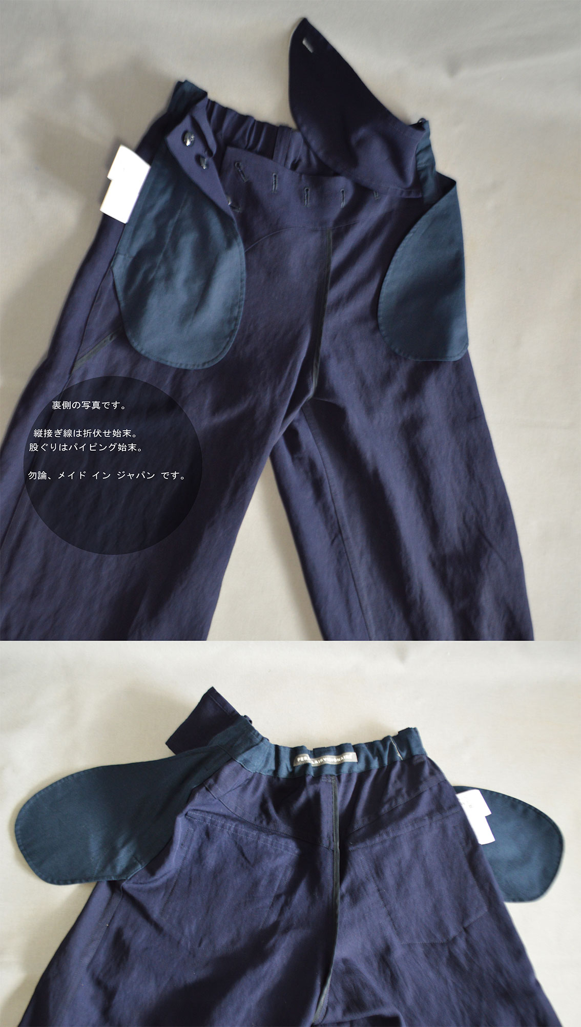 脇接ぎ線は折り伏せ始末。股ぐりはパイピング始末。 左身頃ボタン開き。ボタンは合計9個。ボタンは4~5個開ければ着脱可能です。両脇に切り替えポケット付き。後ろ身頃にフラップ付きアウトポケット2ケ付き。後ろベルトにはゴム入りでギャザー付き。 勿論、メイド イン ジャパン です。