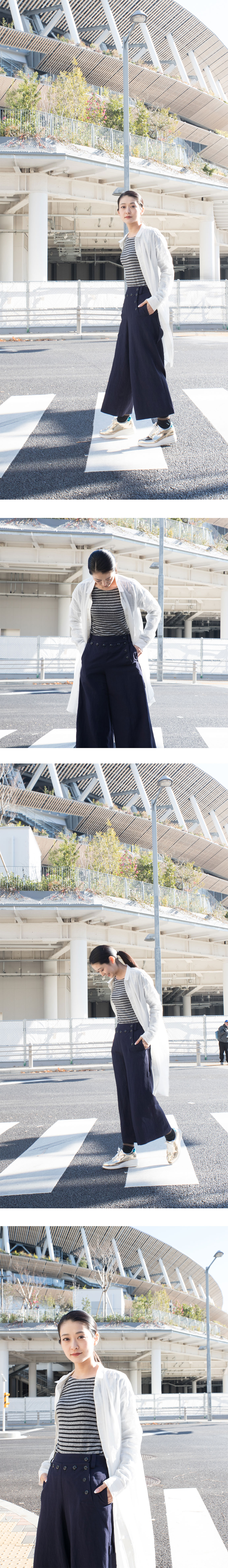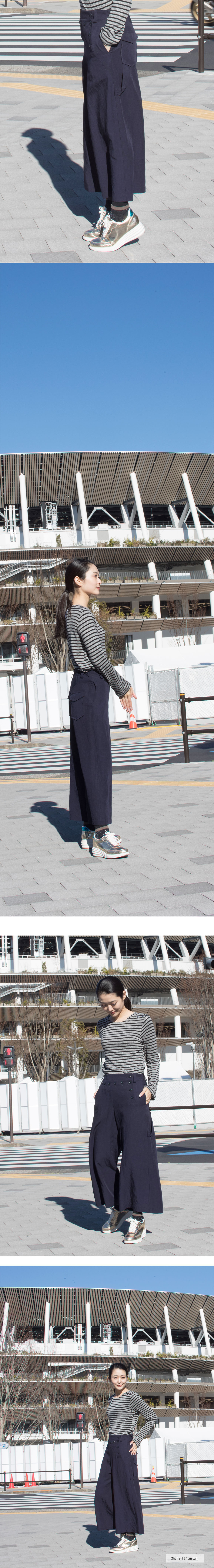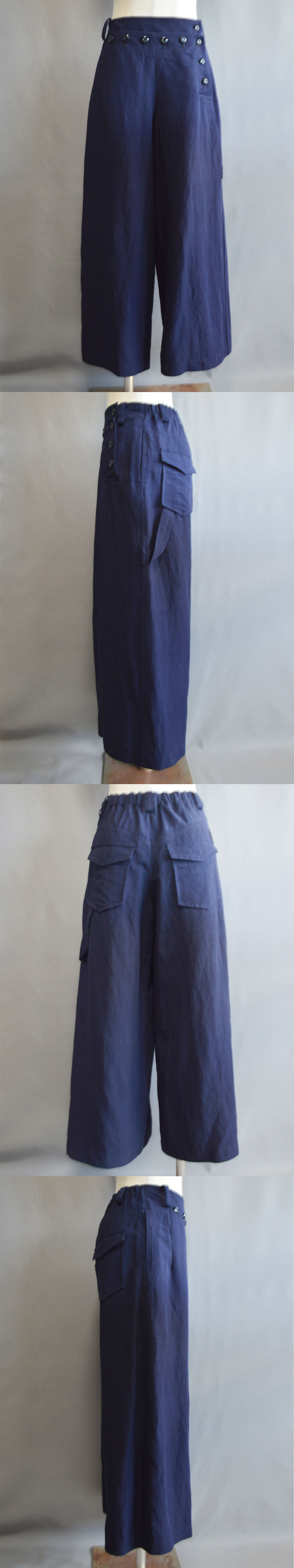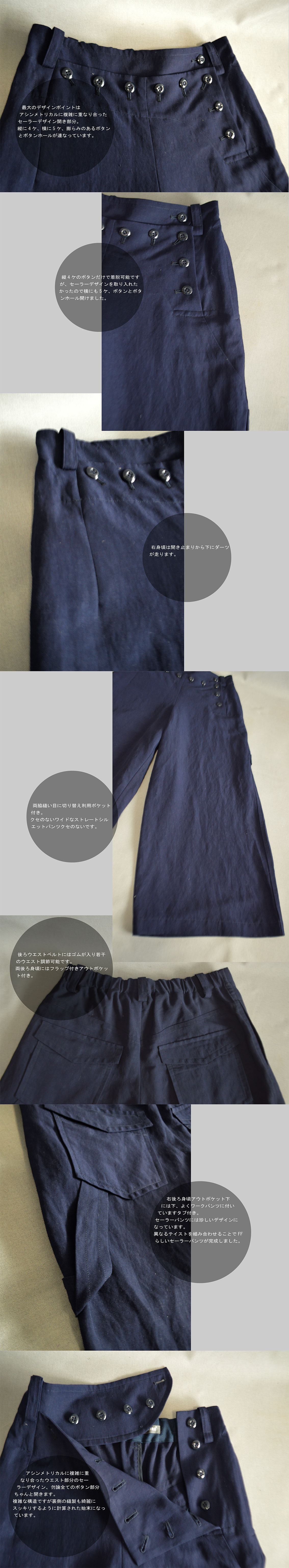 春夏物で一重仕立てなので軽快に着こなしてほしいワイドパンツです。セーラーデザインということもありオススメはど定番のボーダーTシャツとのコーディネート、ボーダーTとの王道のマリンテイストもこのパンツとでしたらそこまで過剰なマリンテイストにならずシンプルに提案できます。2020春に流行ると予想されているマリンテイストをいち早くゲットしてください。 もちろん同時販売の斜めデザインストライプシャツとも相性はよいです。
