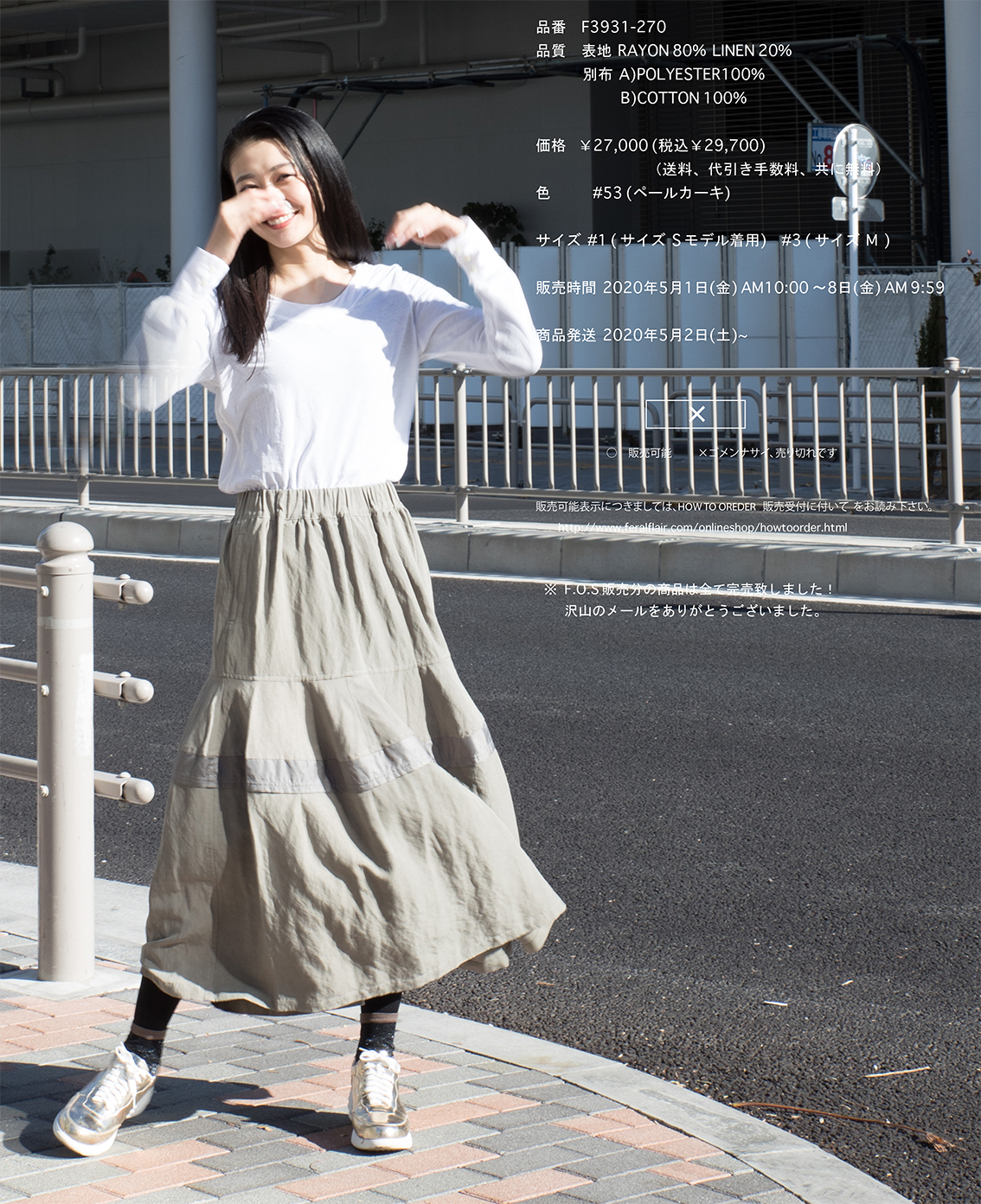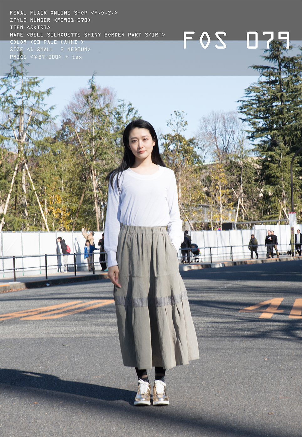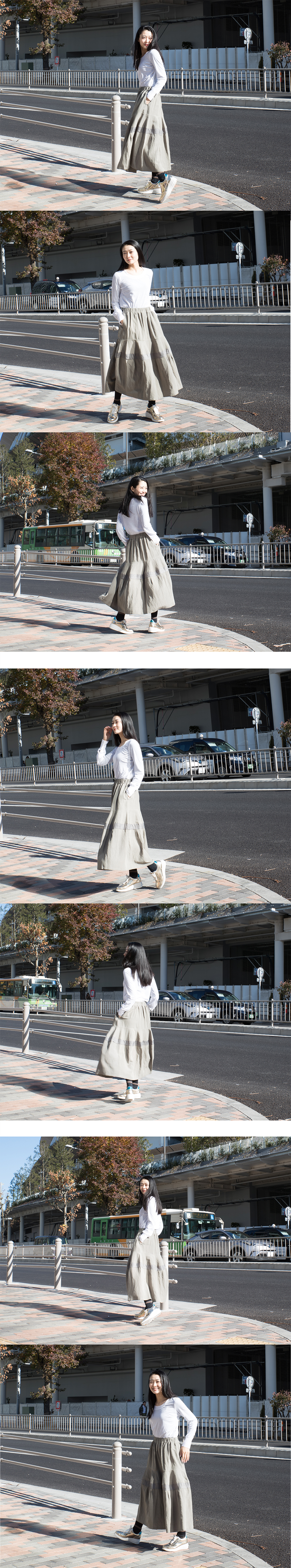 カーキ色はあまりFF では登場しませんが、今回販売しますグレーの混じったカーキ色はお気に入りのカラーです。カーキ色といえば連想されるのがアーミーテイストやオータムカラーですが、このスカートのペールカーキはそのテイストよりは落ち着いたナチュラルさと大人のワークテイストさを感じさせてくれます。 カーキ色でも特にクセがなく白、黒、グレー、ネイビーとも相性はいいです。