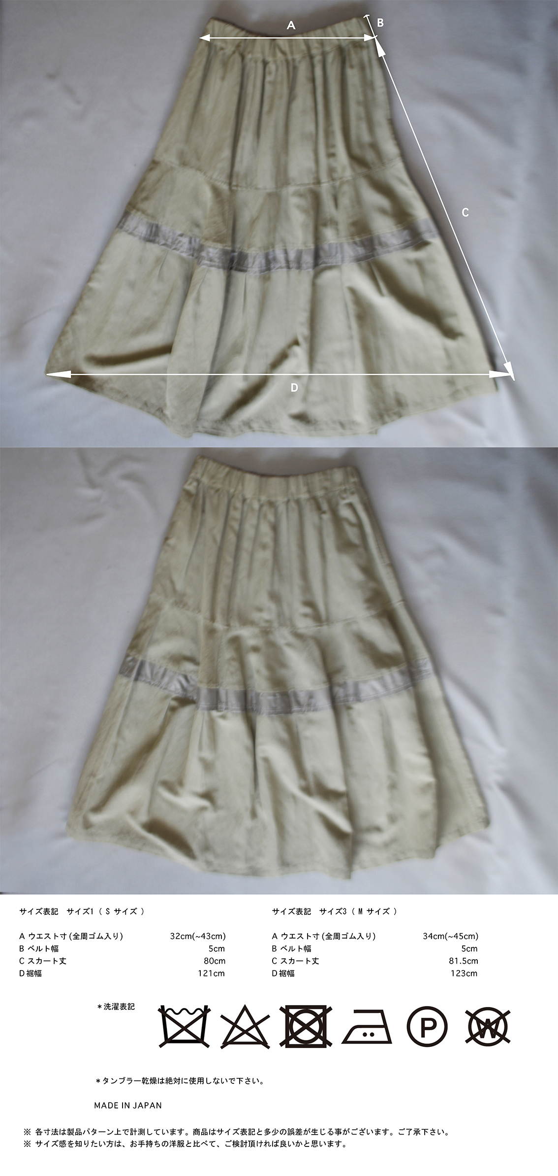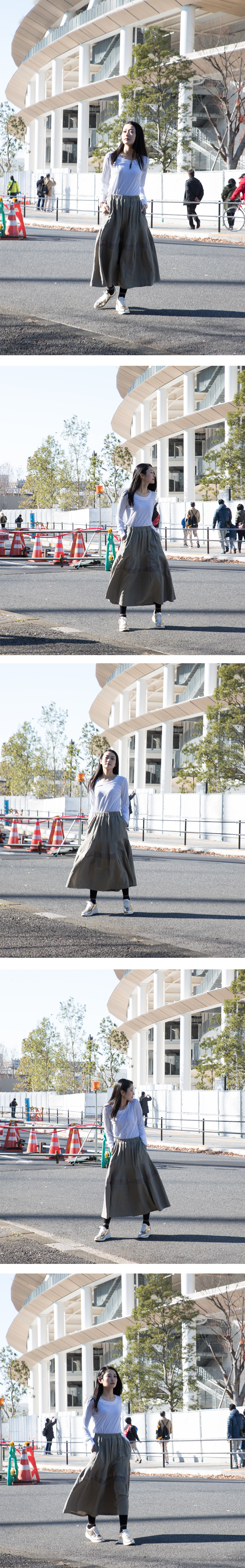 ウエストはベルト始末で一周ゴム入り。身頃はボーダー状に四段の切り替えになっています。 ベルト下から派生するギャザーが裾に広がる一段目の切り替え。 二段目の切り替えはフレアーパターンになっています。ここがポイントとなりベルのようなシルエットを作り出しています。 三段目の切り替えはポリエステルタフタの光沢感が効いている細い直線パターン。 下の四段目の切り替えとは少し浮かした状態に見えるように内側で接がれています。めくると四段目の切り替えはタックを寄せながら接がれています。 スカート丈は81cm と大人っぽく履ける丈になっています。