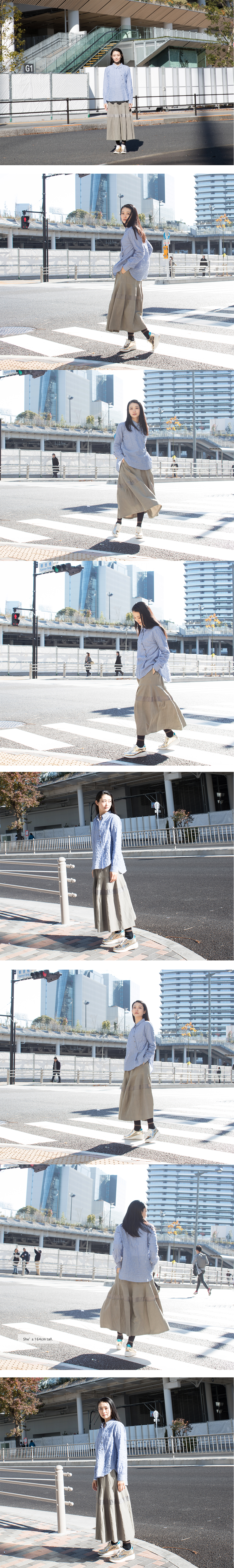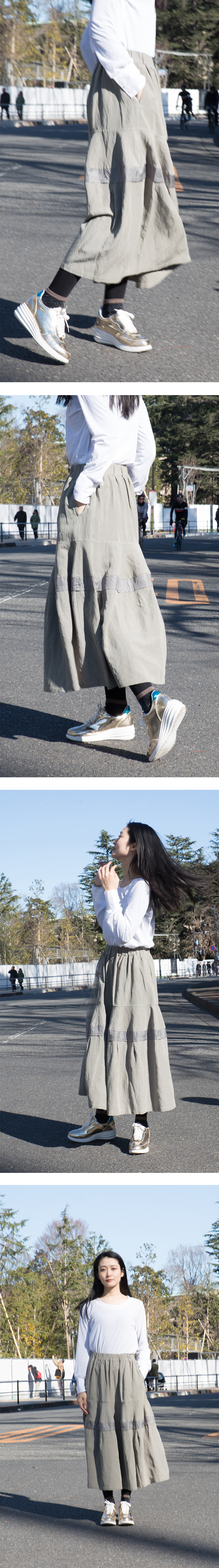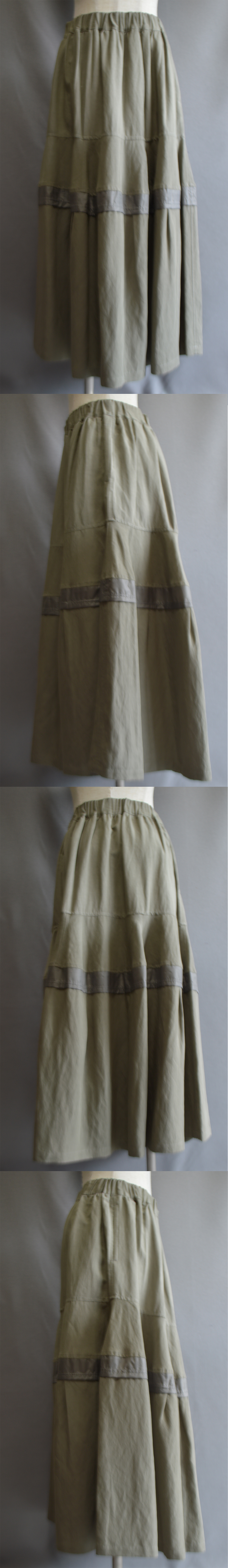 FOS第七十九弾にお届けするのは、履きやすさとシルエットの面白さ、そしてボーダー状にはめ込まれた同系色の異素材とのコントラストが美しいウエストゴム始末のロングスカートです。 春先も夏も軽快であり履きやすく手入れが簡単なように裏地はあえて付けず一重仕立て。 シルエットも普通のAラインシルエットではなく、ヒップ下にフレアパターンをはめ込むことで生まれる少し変わったベルのようなシルエット。もちろんたっぷりとした分量感があり素材にはドレープ性がありますのでそこまで強く特殊なシルエットを主張してはいませんがそれがかえってクールです。 そしてベル状のパターンの下に組み合わされた同系色の異素材とのコントラスト。 本体はマットなナチュラルな素材、そこにはめ込まれたポリエステルタフタの光沢感、その対比のコントラストが美しいです。